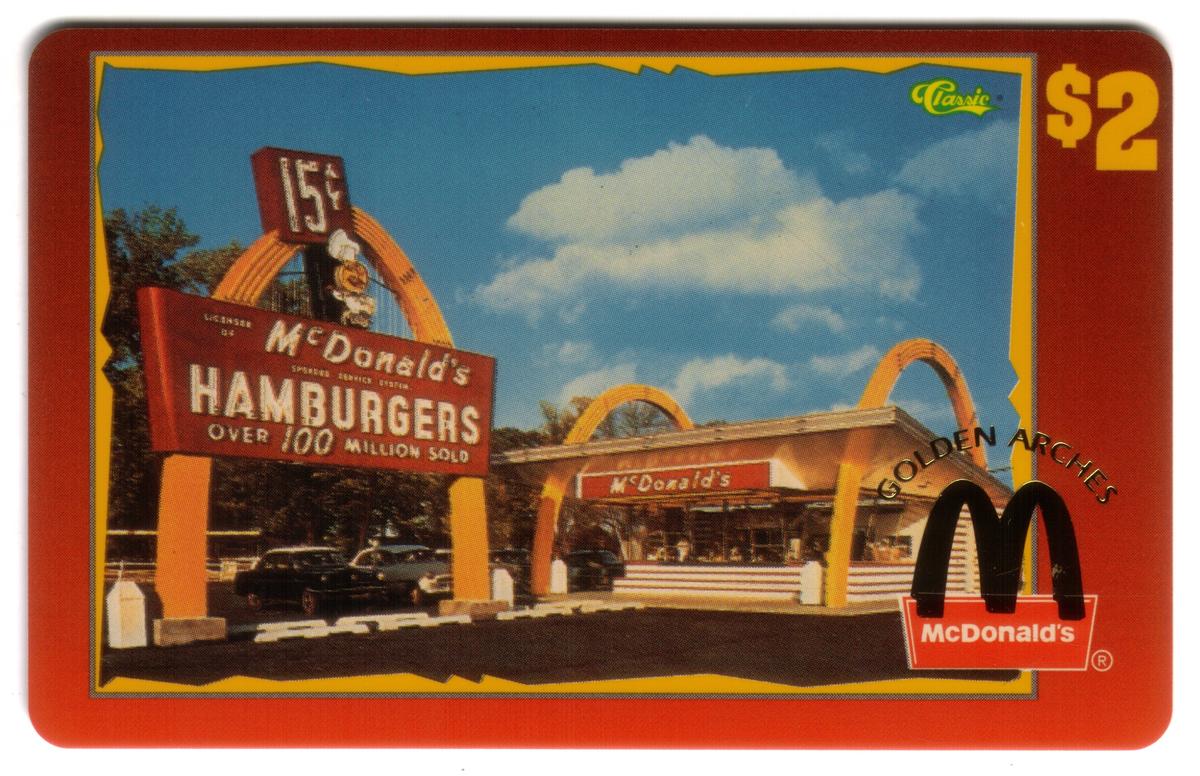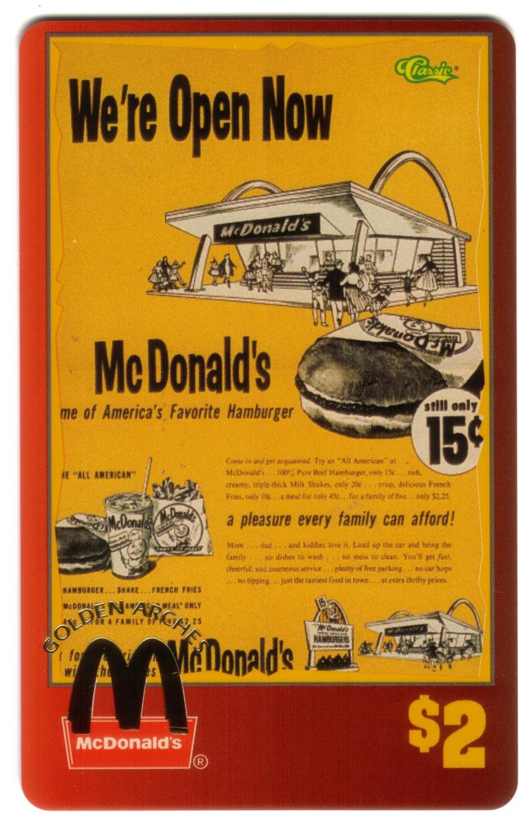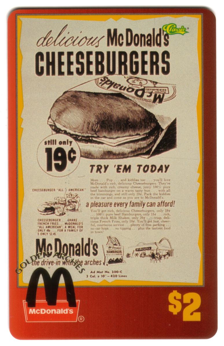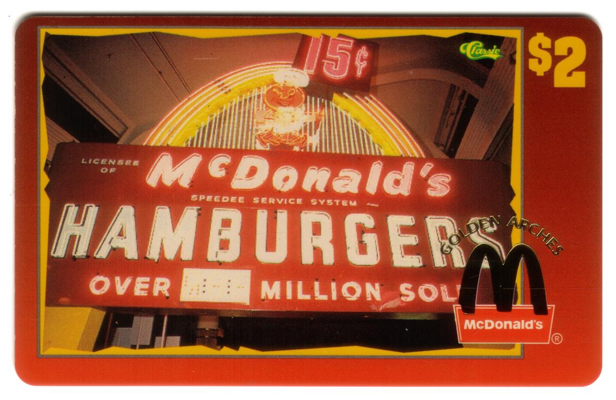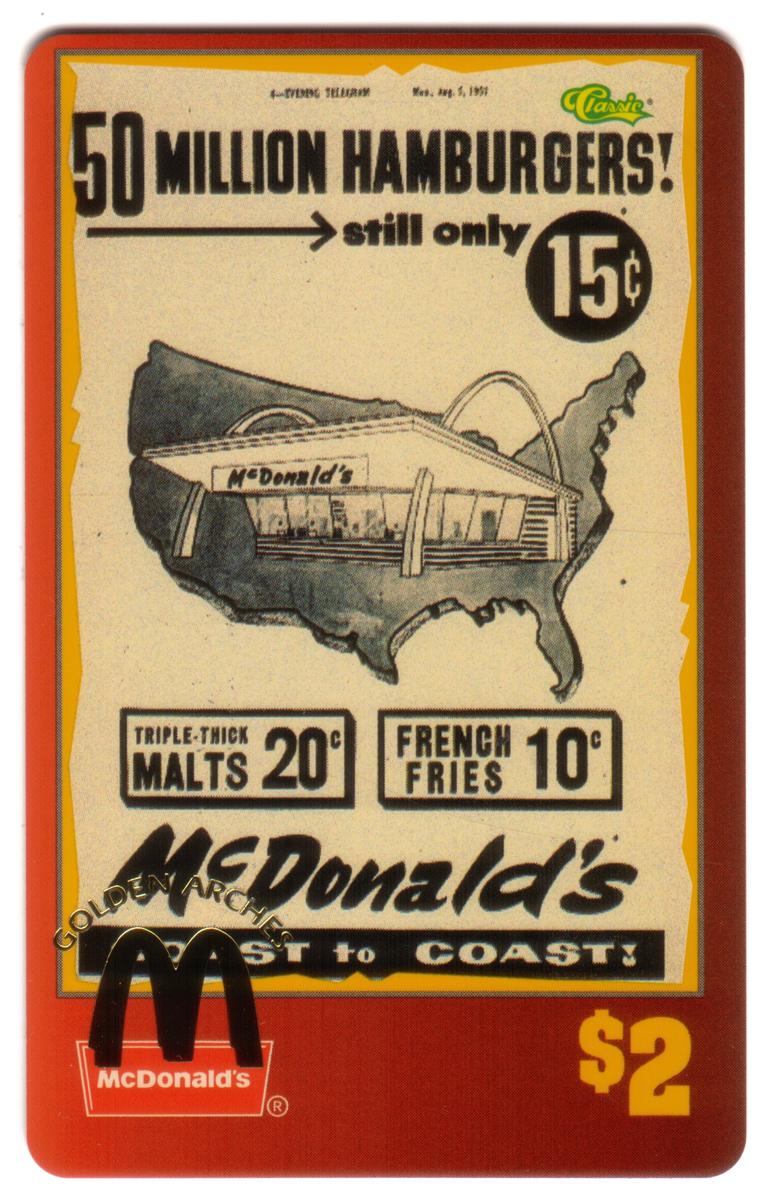 This collection features a complete set of 50 different $2 McDonald's collectible phone cards from 1996, each showcasing iconic McDonald's imagery, logos, and historical advertisements. The cards prominently display the McDonald's Golden Arches logo, along with the "McDonald's" name rendered in its classic font style throughout. Many cards highlight vintage McDonald’s signage, billboards, and marketing menus, including nostalgic advertisements for hamburgers priced between 15¢ and 50¢. These depict early McDonald’s promotions such as "McDonald's 50¢ ALL AMERICAN,” “delicious McDonald's CHEESEBURGERS still only 19¢,” and “50 MILLION HAMBURGERS! still only 15¢,” emphasizing the brand’s heritage.