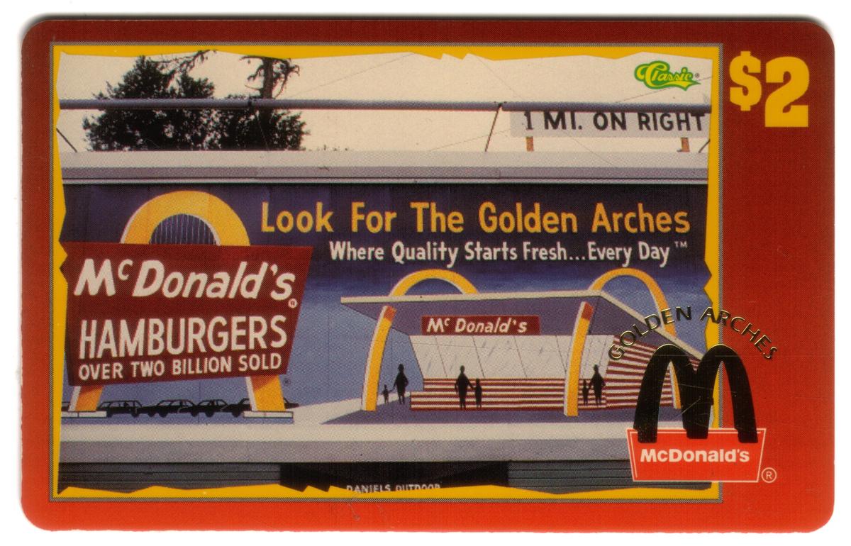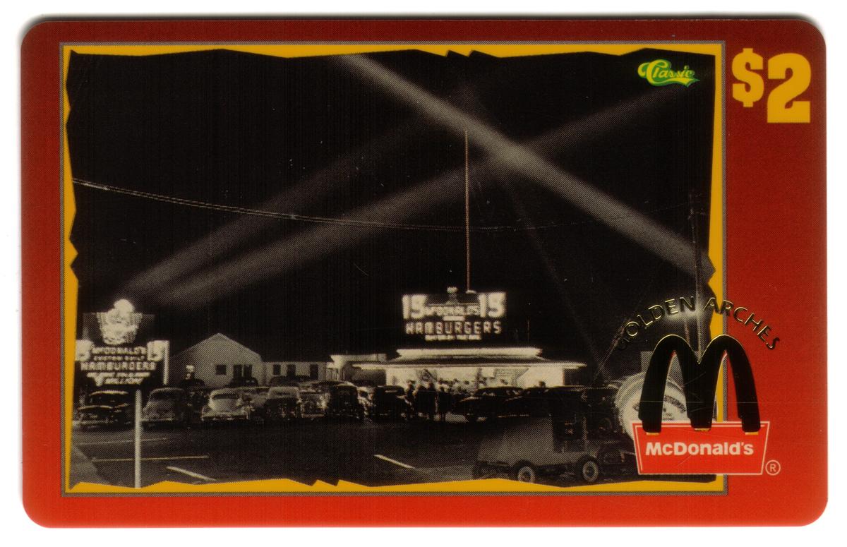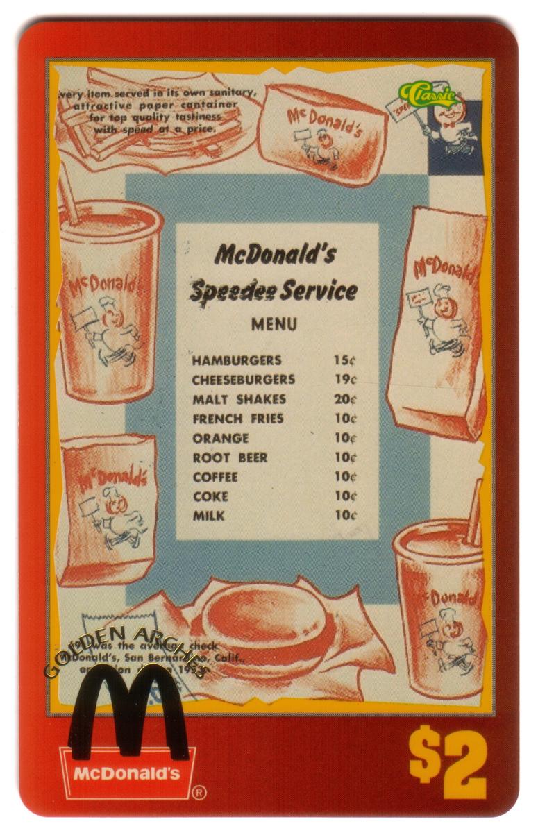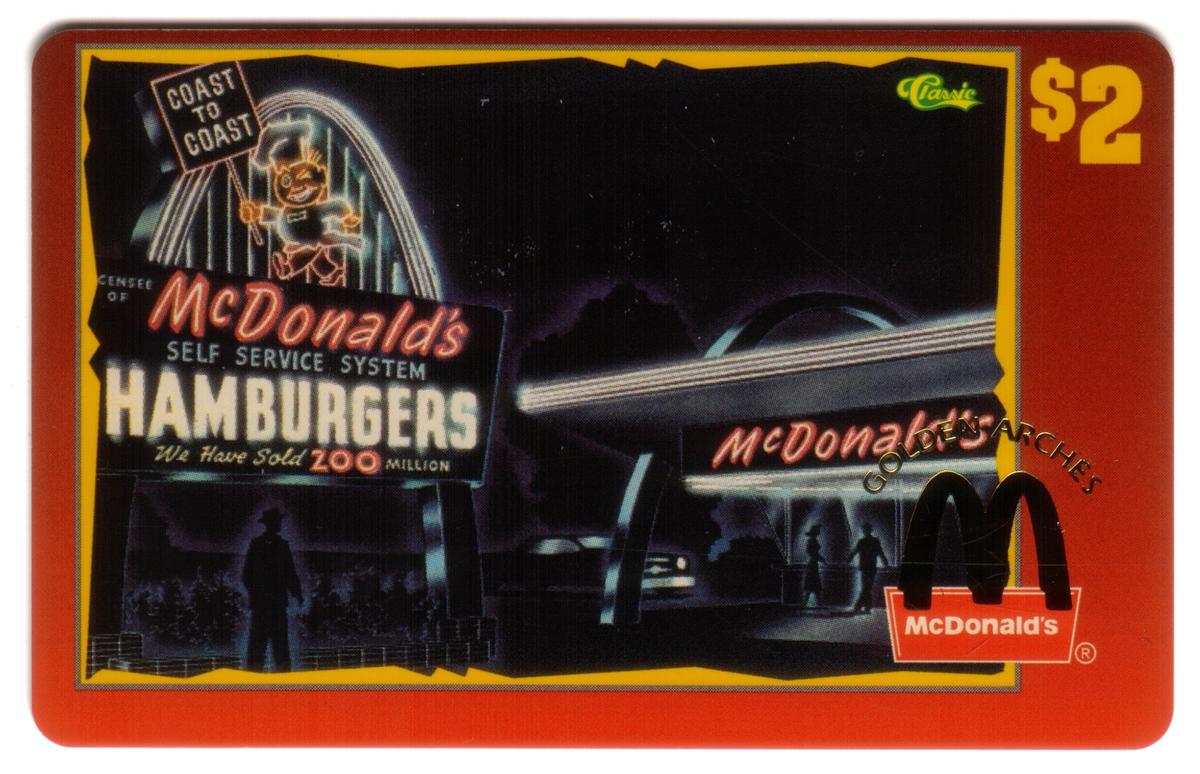 This collection features a complete set of 50 different $2 McDonald's collectible phone cards from 1996, each showcasing iconic McDonald's imagery, logos, and historical advertisements. The cards prominently display the McDonald's Golden Arches logo, along with the "McDonald's" name rendered in its classic font style throughout. Many cards highlight vintage McDonald’s signage, billboards, and marketing menus, including nostalgic advertisements for hamburgers priced between 15¢ and 50¢. These depict early McDonald’s promotions such as "McDonald's 50¢ ALL AMERICAN,” “delicious McDonald's CHEESEBURGERS still only 19¢,” and “50 MILLION HAMBURGERS! still only 15¢,” emphasizing the brand’s heritage.