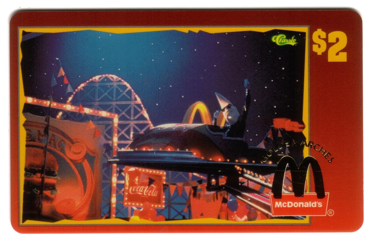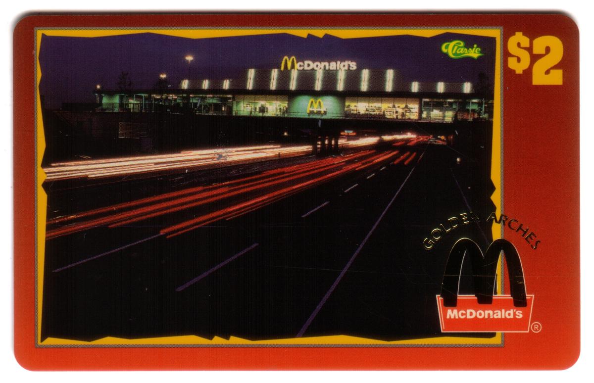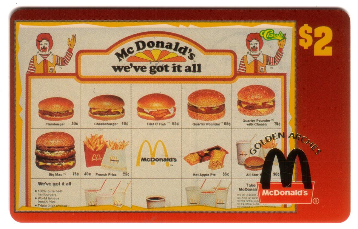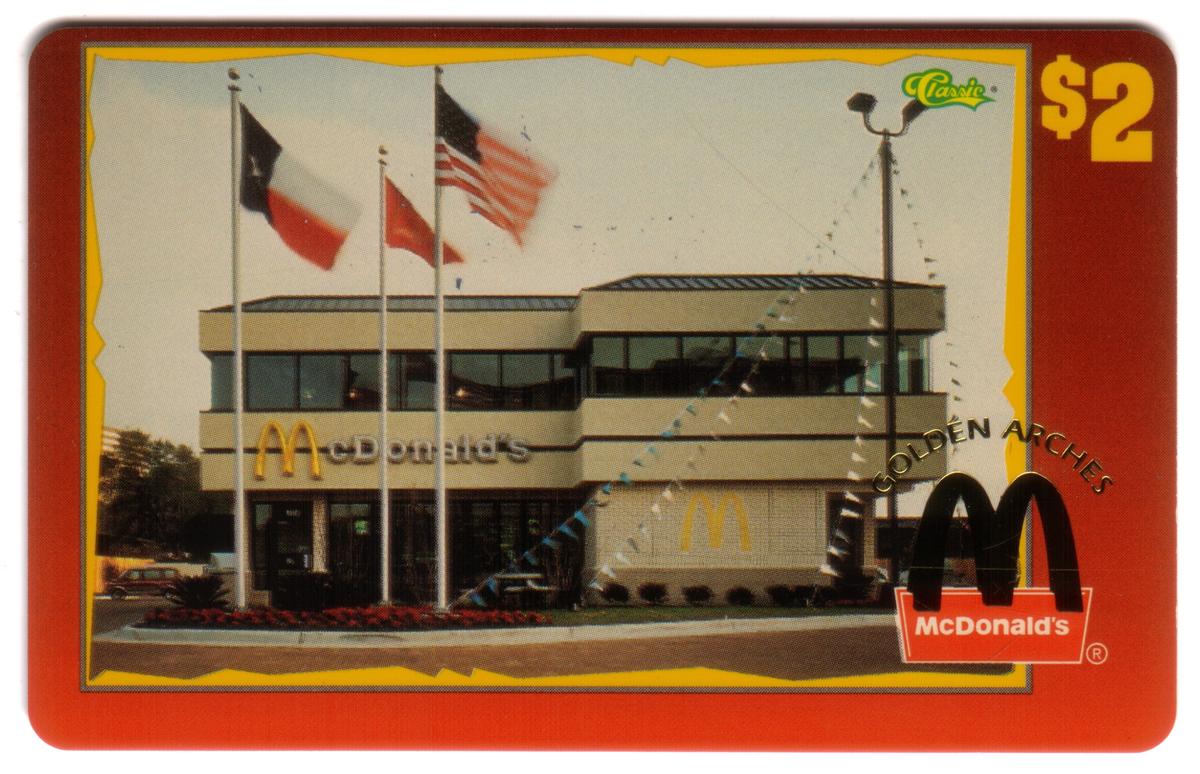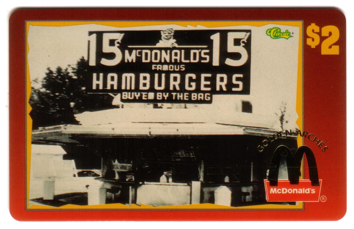 This collection features a complete set of 50 different $2 McDonald's collectible phone cards from 1996, each showcasing iconic McDonald's imagery, logos, and historical advertisements. The cards prominently display the McDonald's Golden Arches logo, along with the "McDonald's" name rendered in its classic font style throughout. Many cards highlight vintage McDonald’s signage, billboards, and marketing menus, including nostalgic advertisements for hamburgers priced between 15¢ and 50¢. These depict early McDonald’s promotions such as "McDonald's 50¢ ALL AMERICAN,” “delicious McDonald's CHEESEBURGERS still only 19¢,” and “50 MILLION HAMBURGERS! still only 15¢,” emphasizing the brand’s heritage.