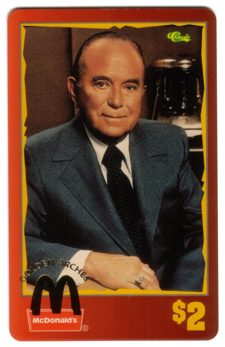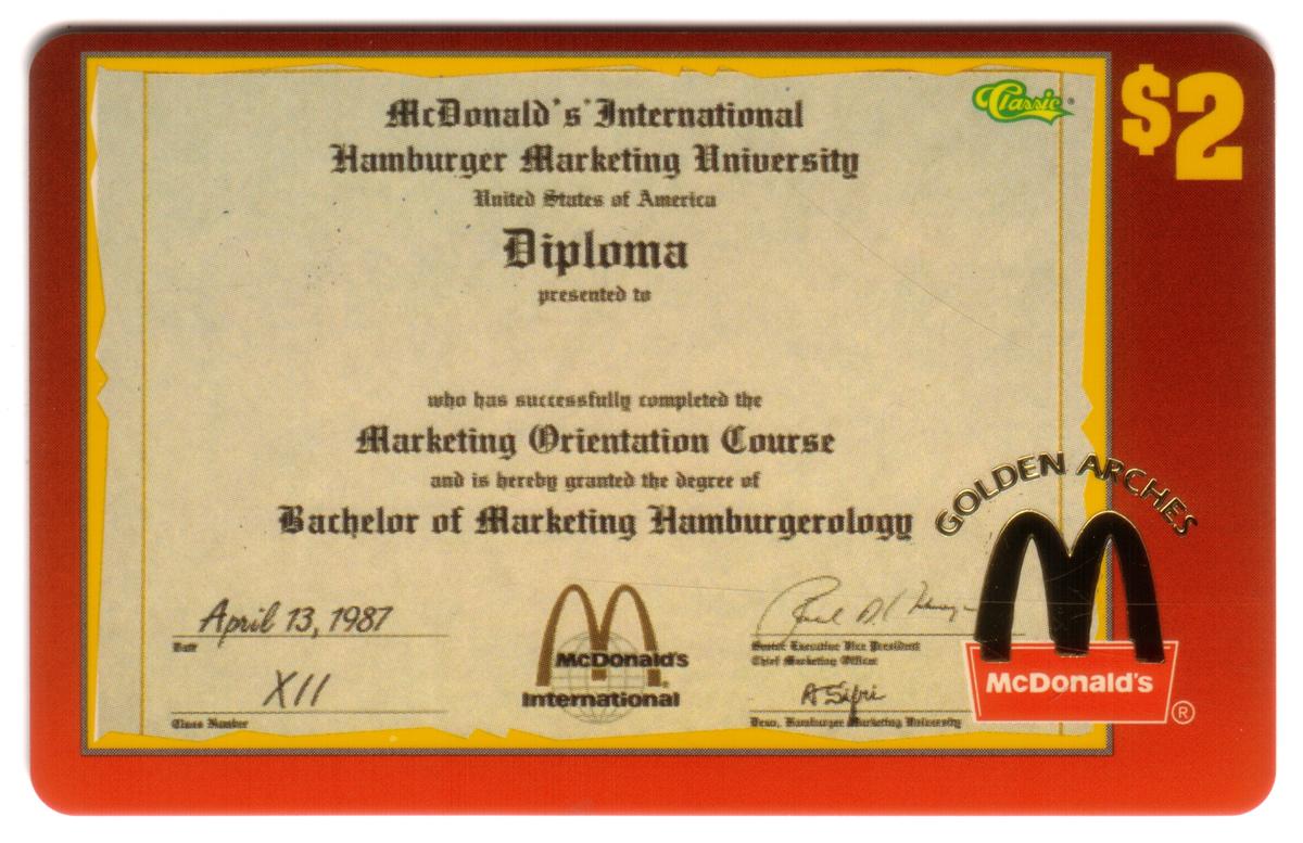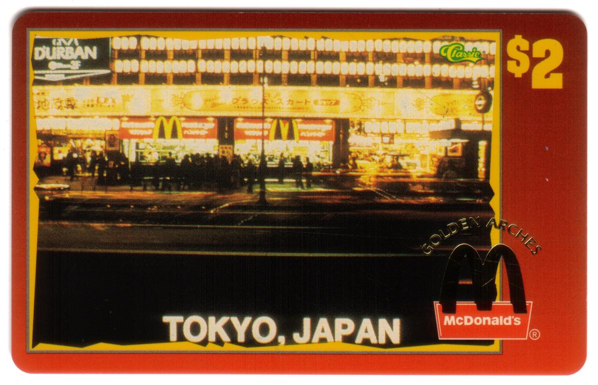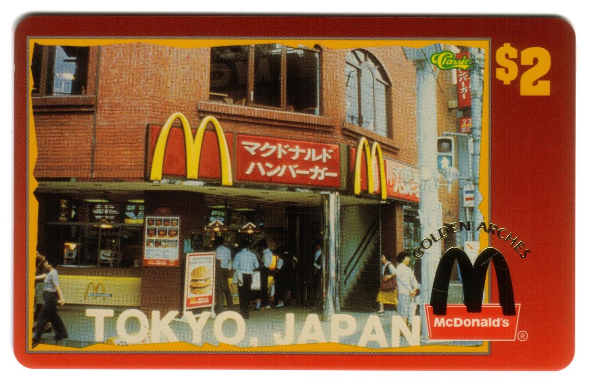 Several cards capture McDonald’s locations and signage across different geographic areas, including two cards labeled "TOKYO, JAPAN," depicting bustling storefronts with Japanese signage and large McDonald’s Golden Arches. Other cards present notable McDonald’s landmarks such as Hamburger University and management training facilities, with one card featuring an official diploma from “McDonald's International Hamburger Marketing University,” dated April 13, 1987. Additional cards honor Ronald McDonald, including one displaying a portrait of a man presumed to be Ray Kroc, the influential figure behind McDonald’s expansion.