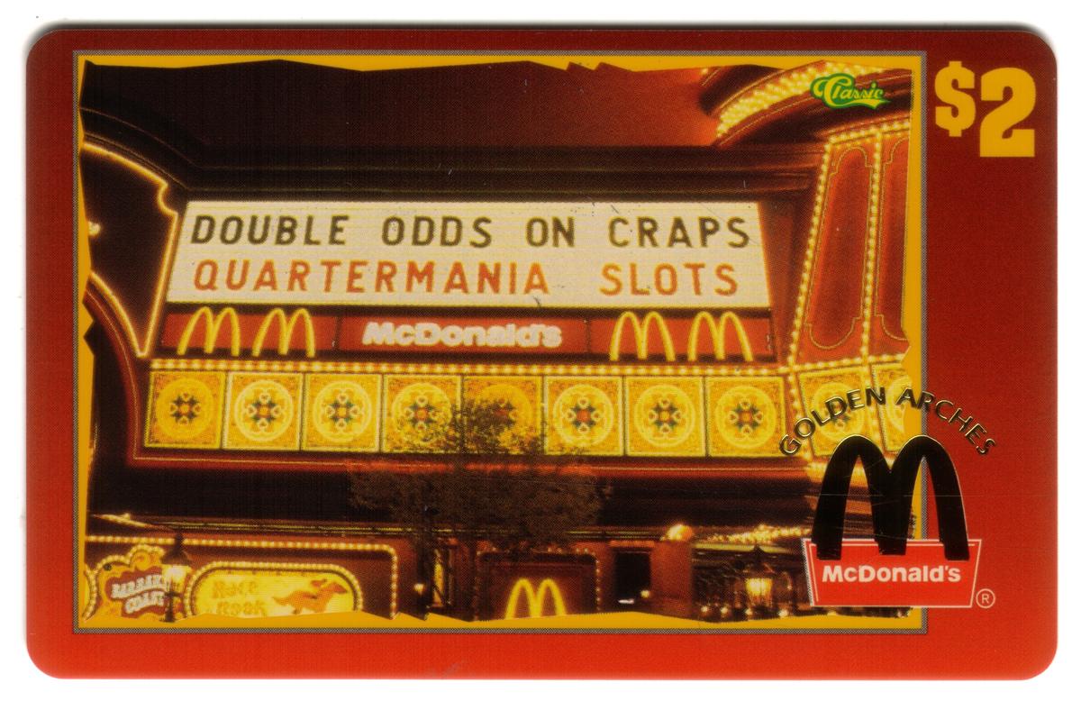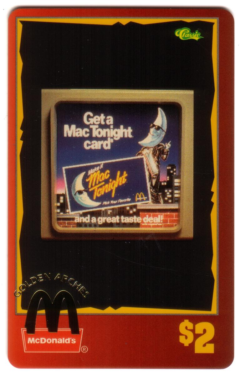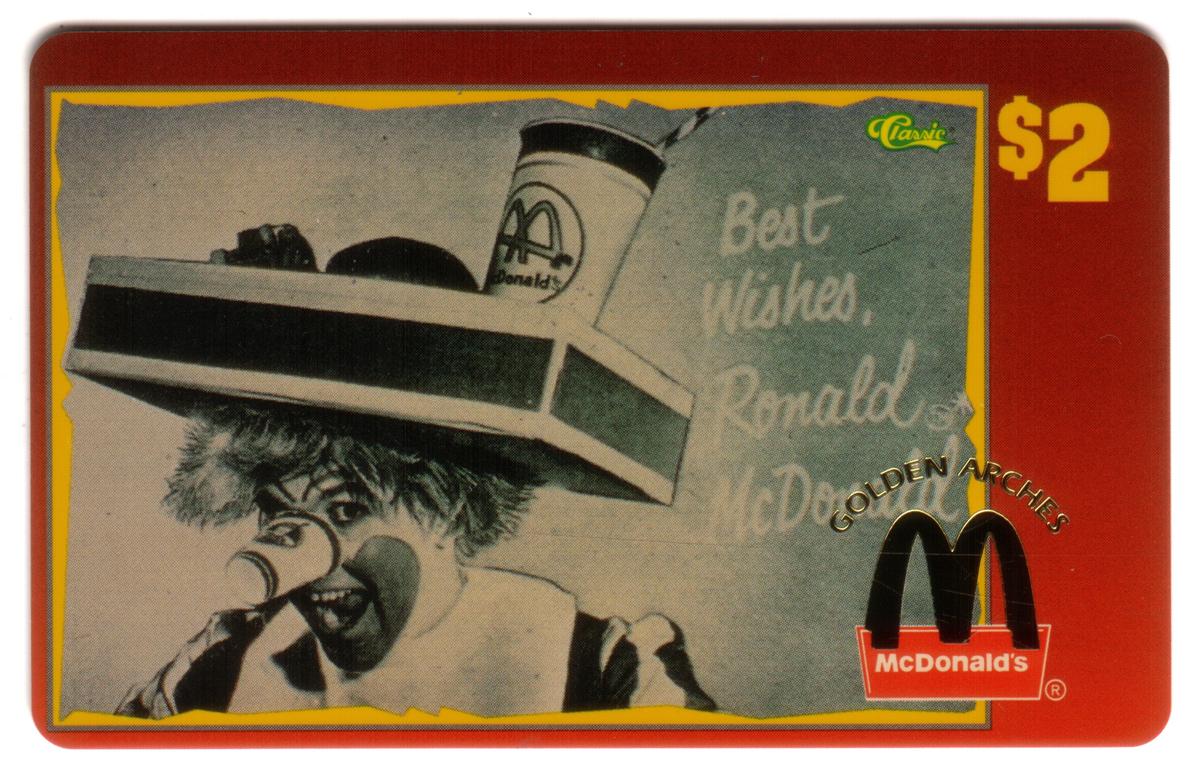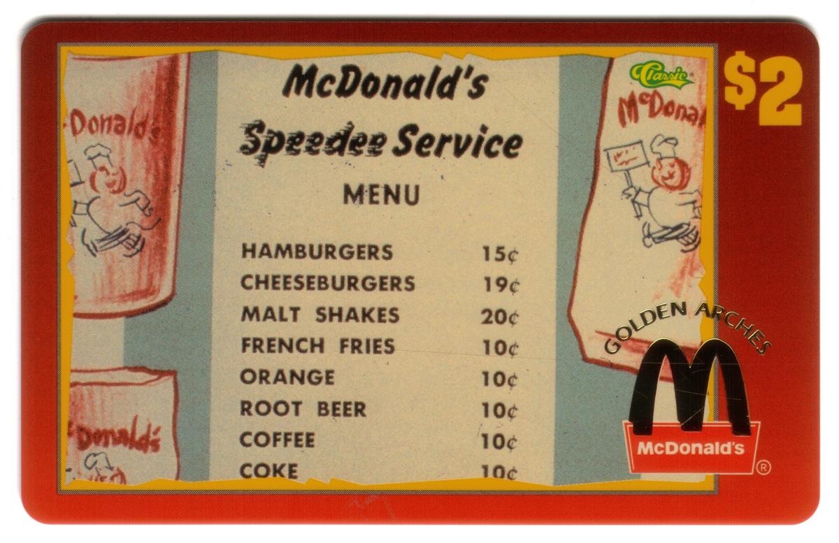 A portion of the set showcases different eras of McDonald’s signage and advertising styles, including neon signs at night, classic roadside and drive-in designs, and playful mascots such as “Speedee” and the “Mac Tonight” moon character. The cards present various retro McDonald's menus and promotional materials complete with vintage prices for items such as hamburgers, cheeseburgers, malts, and fries. Other snapshots include scenes from famous McDonald’s locations, nighttime shots of a casino marquee advertising “QUARTERMANIA SLOTS” alongside McDonald’s neon signs, and whimsical images like Ronald McDonald with a tray or pointing towards a calendar promotion. The set vividly celebrates McDonald’s rich advertising history, worldwide presence, and cultural impact through diverse, collectible imagery.