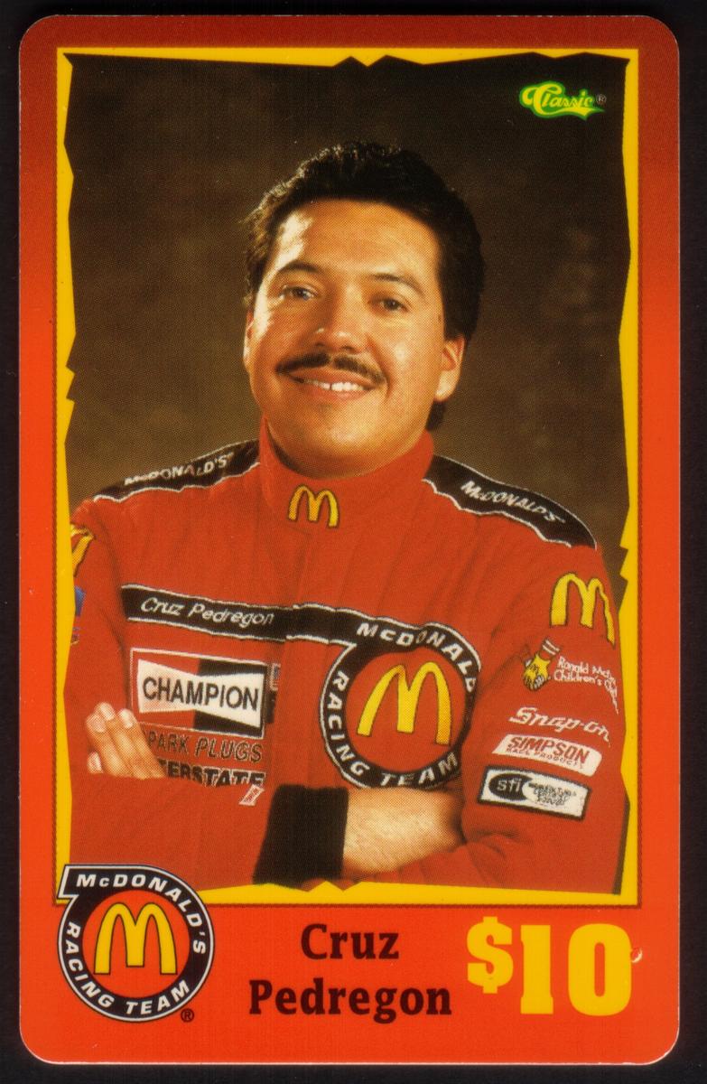 The other five cards present racing vehicles associated with the McDonald's Racing Team. These cards feature the McDonald's Top Fuel Dragster, McDonald’s Funny Car, McDonald’s Pro Stock Car, and images of team members standing by their vehicles. Notably, "Cory Mac" stands next to the McDonald’s Top Fuel Dragster race car. Jim Yates is posed with the McDonald’s Pro Stock Car, while Cruz Pedregon is positioned with the McDonald’s Funny Car. All vehicles prominently display the McDonald's logo and other sponsor decals including Pontiac, Shell, Dynomax, Champion, and Simpson in vibrant red, white, and yellow paint schemes. Each vehicle card states the type of car and its affiliation with McDonald’s in bold text at the bottom.