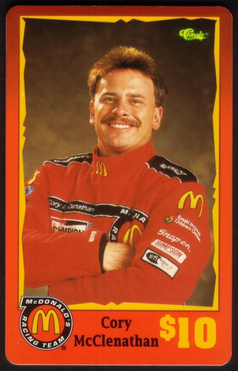 This complete set of ten collectible cards features members and cars from the McDonald's Racing Team, produced in 1996. Each card has a consistent design with a red border accented by a black interior background framed with a dynamic yellow outline. The McDonald's logo appears in a circular "McDonald’s Racing Team" emblem on the lower left corner of each card. The denomination "$10" is prominently displayed on each card in bold yellow print.