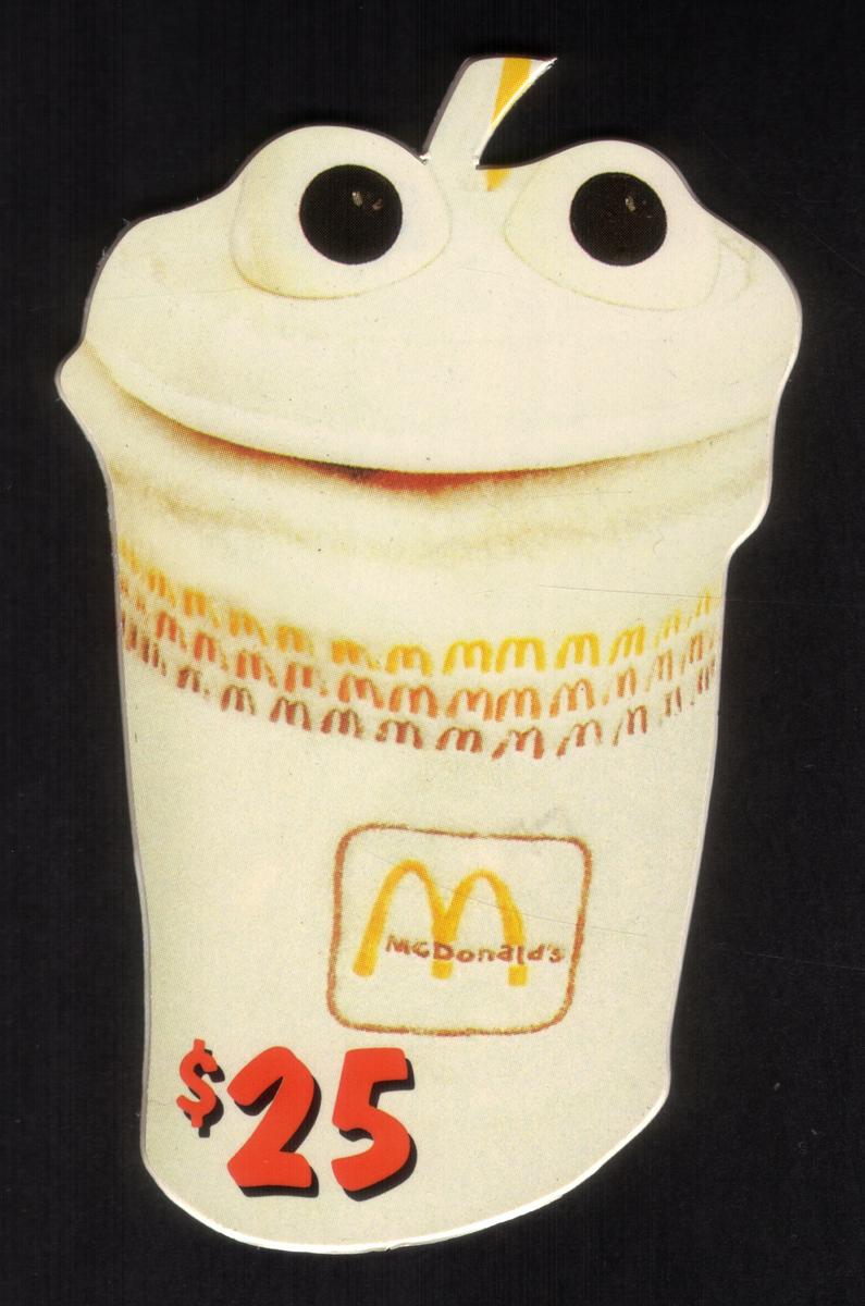 The soft drink card features a white cup with a straw protruding from the top. The cup also has large eyes near the top and a wide smile. Decorative rows of the McDonald's Golden Arches logo in multicolored reds, oranges, and yellows encircle the cup, along with a framed McDonald’s logo on the front.