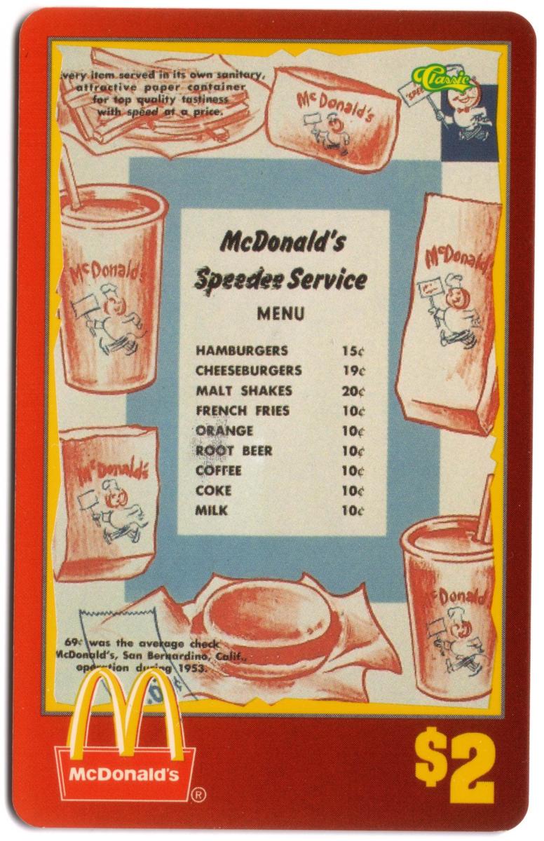 This collectible card features McDonald's 1996 Speedee Service Menu from 1955, highlighting a classic fast food theme. The front of the card prominently displays the Golden Arches logo in bright yellow at the top left corner, symbolizing the iconic McDonald's brand. The background shows a vintage menu layout with clear text and pricing, including the "$2" prominently positioned near the arches. The card design reflects the style and branding elements consistent with McDonald's history and its early fast food service era.