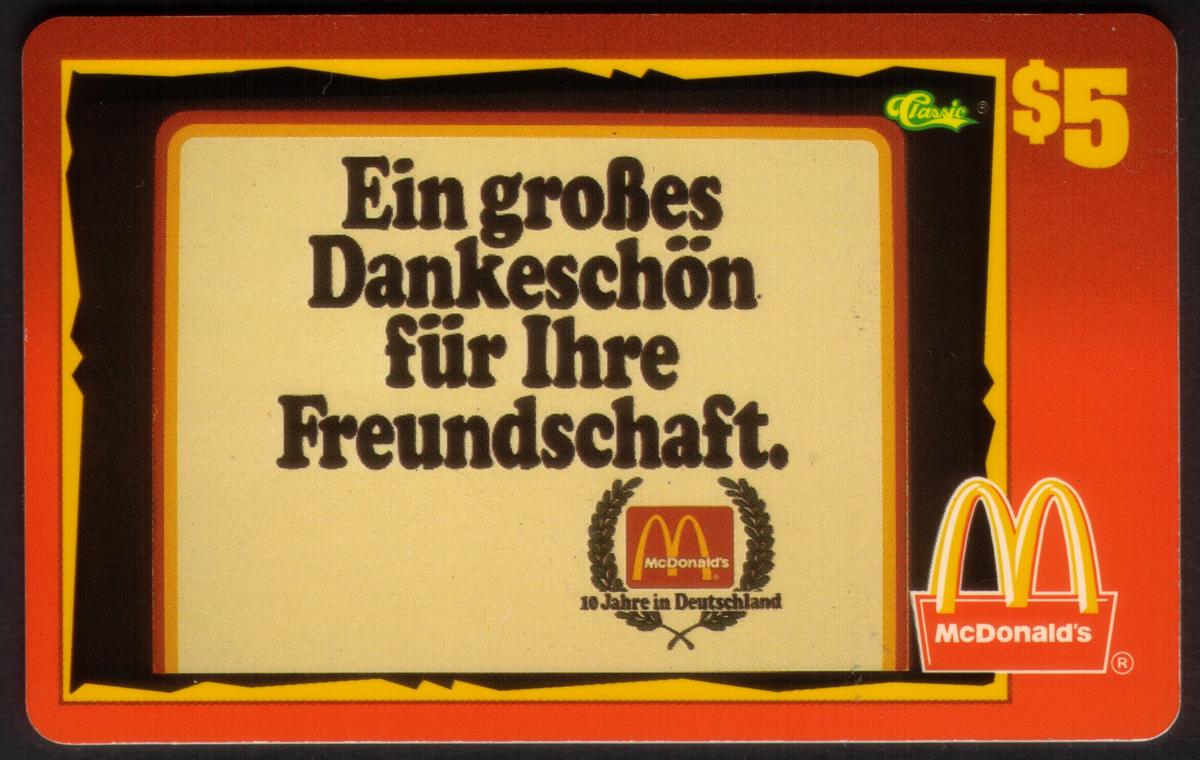 This collectible card features the McDonald’s logo prominently with the iconic Golden Arches symbol. The text on the card includes “McDonald’s 1996: 10 Years In Germany,” indicating it commemorates a decade of McDonald’s presence in Germany. It has a denomination of $5 in U.S. currency, shown clearly on the card. The design includes a classic scoreboard pattern in the background, giving the card a sporty and nostalgic feel.