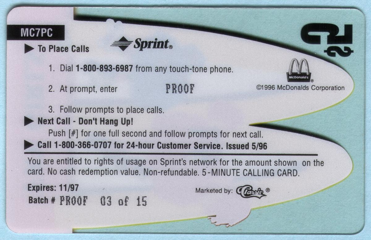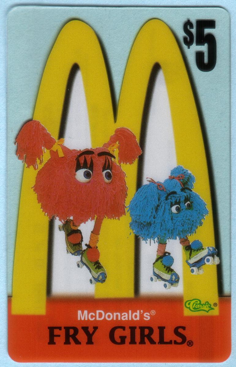 This McDonald’s collectible card dates from 1996 and is associated with the promotion titled "Fry Girls #MC7PC." The card is noted as an acetate internal proof and is part of a series linked to McDonald’s fast food chains and restaurants, representative of the classic Golden Arches branding. The playful design highlights McDonald’s themed characters from that era and reflects promotional material connected to the mc7pc $5 series.