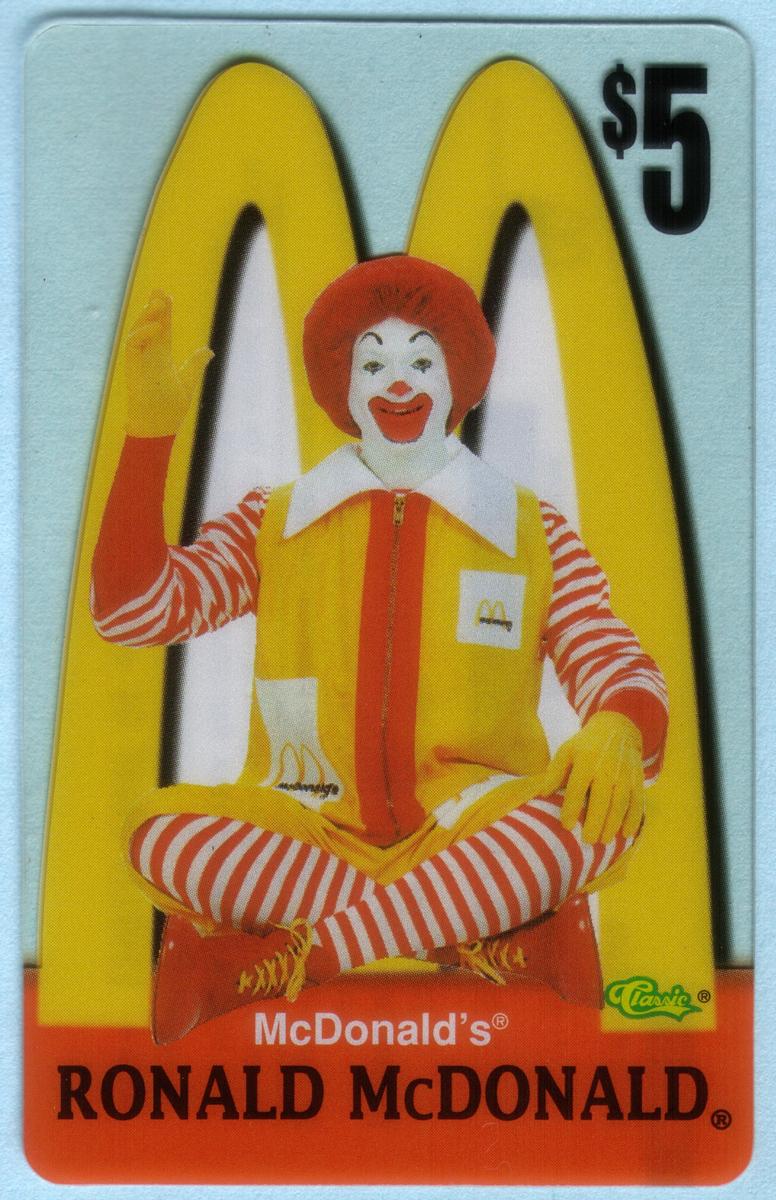 This collectible card features a full-color image of Ronald McDonald, the iconic mascot of McDonald's fast food chain. Ronald McDonald is depicted sitting cross-legged in front of the famous Golden Arches logo, which is prominently displayed in bright yellow behind him. He is dressed in his classic outfit consisting of a red wig, white face makeup with his signature smile, a yellow vest with red zipper and accents, and red-and-white striped long sleeves and pants. His yellow gloves and red shoes complete the costume.