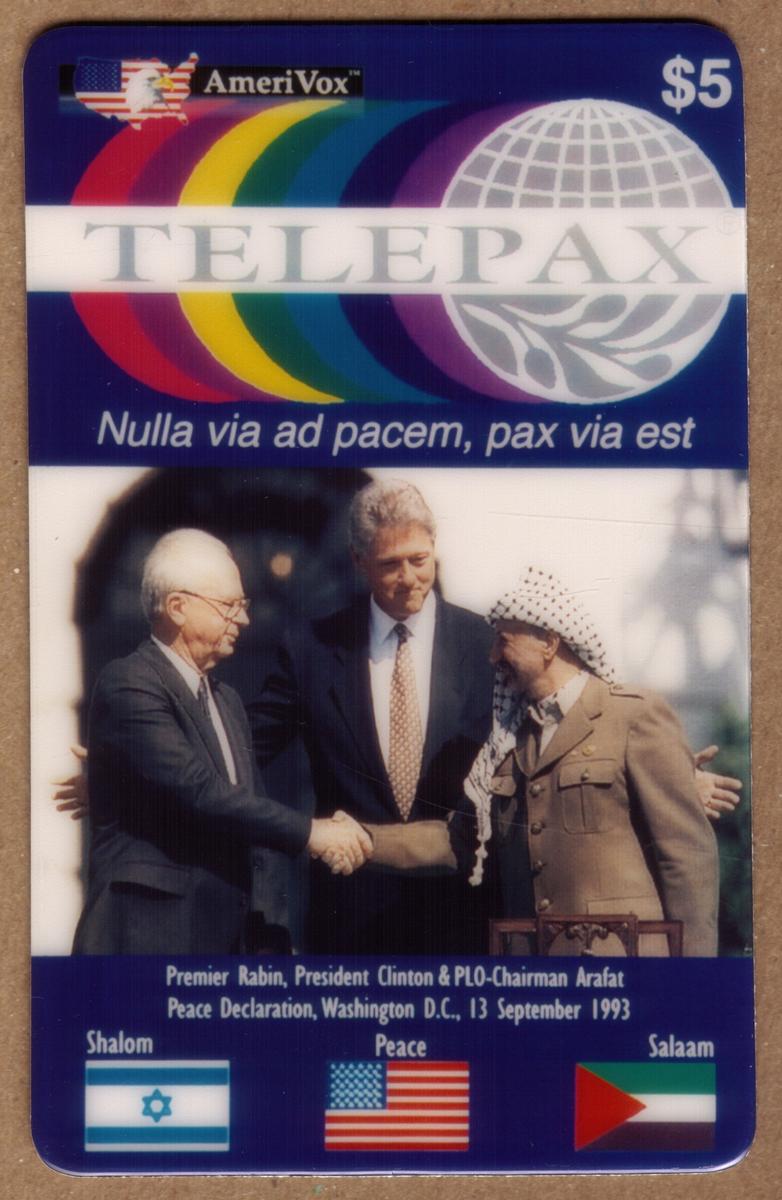 Collectible AmeriVox Telepax card featuring the 1993 Oslo Accords handshake, peace symbols, Latin quote, flags, and international communication details. |