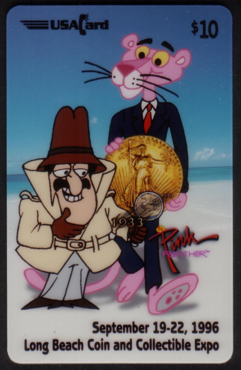 The card is related to the Long Beach Coin Expo held in September 1996, as indicated by text on the card. The USACard Corporation is the issuing entity, and the card ties into themes of cartoons, animation, and collectibles. The design highlights the connection to animation and comic art, showcasing well-recognized figures adored in popular culture.