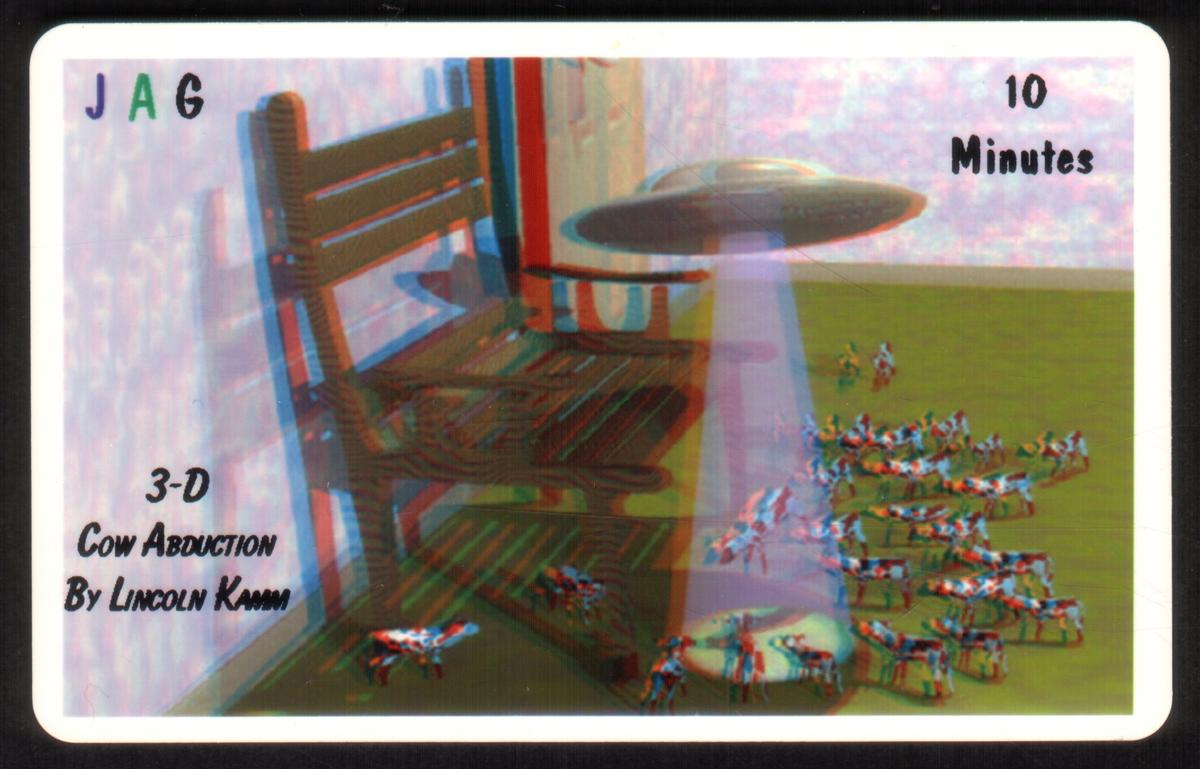 This collectible chip card features a vivid three-dimensional design displaying a classic sci-fi scene of extraterrestrial activity. The central image shows a large silver spaceship hovering above a green field, emitting a bright white beam of light that is lifting a brown and white cow skyward. The 3-D effect enhances the depth of the spaceship and the beam, creating a striking visual on the card’s surface.
