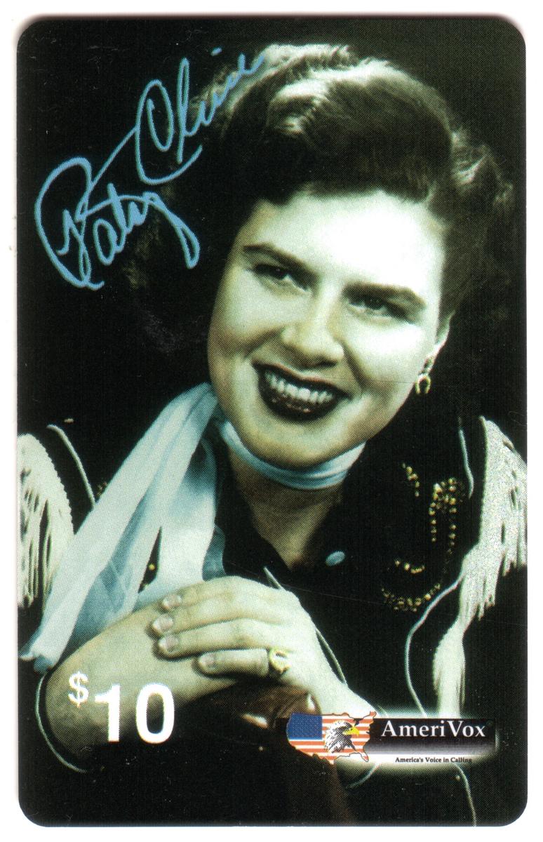 The card’s denomination is $10, prominently displayed on the front, indicating its value for telephone usage. The brand name "AmeriVox" appears, identifying the issuer of the card. Additional text includes Patsy Cline’s name printed clearly, emphasizing her connection to the entertainment category highlighted by the card. The overall design includes a clean layout that focuses on the photographic image and text, with no other graphics or symbols present.