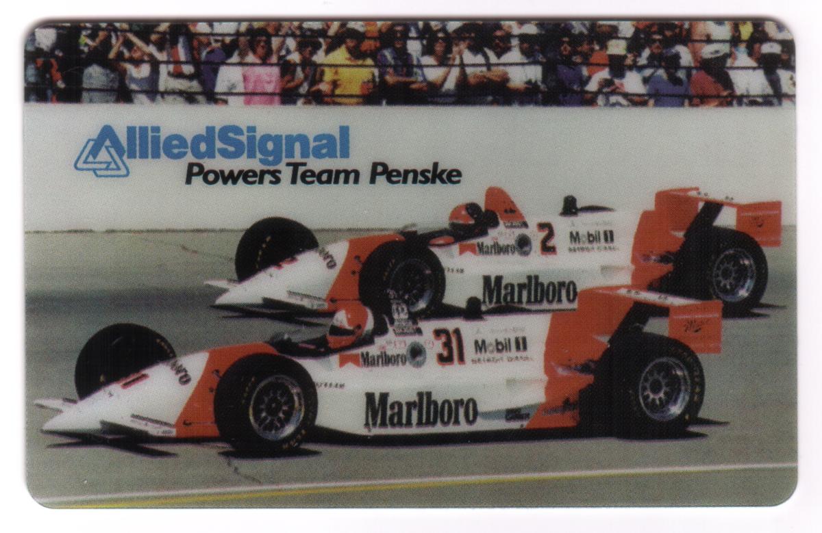 This card represents a collectible related to auto racing, specifically featuring the Penske racing team with sponsorship from Allied Signal, Marlboro, and Mobil. It highlights the heritage and branding of Team Penske in Indy racing during the era when these sponsors were prominent partners.