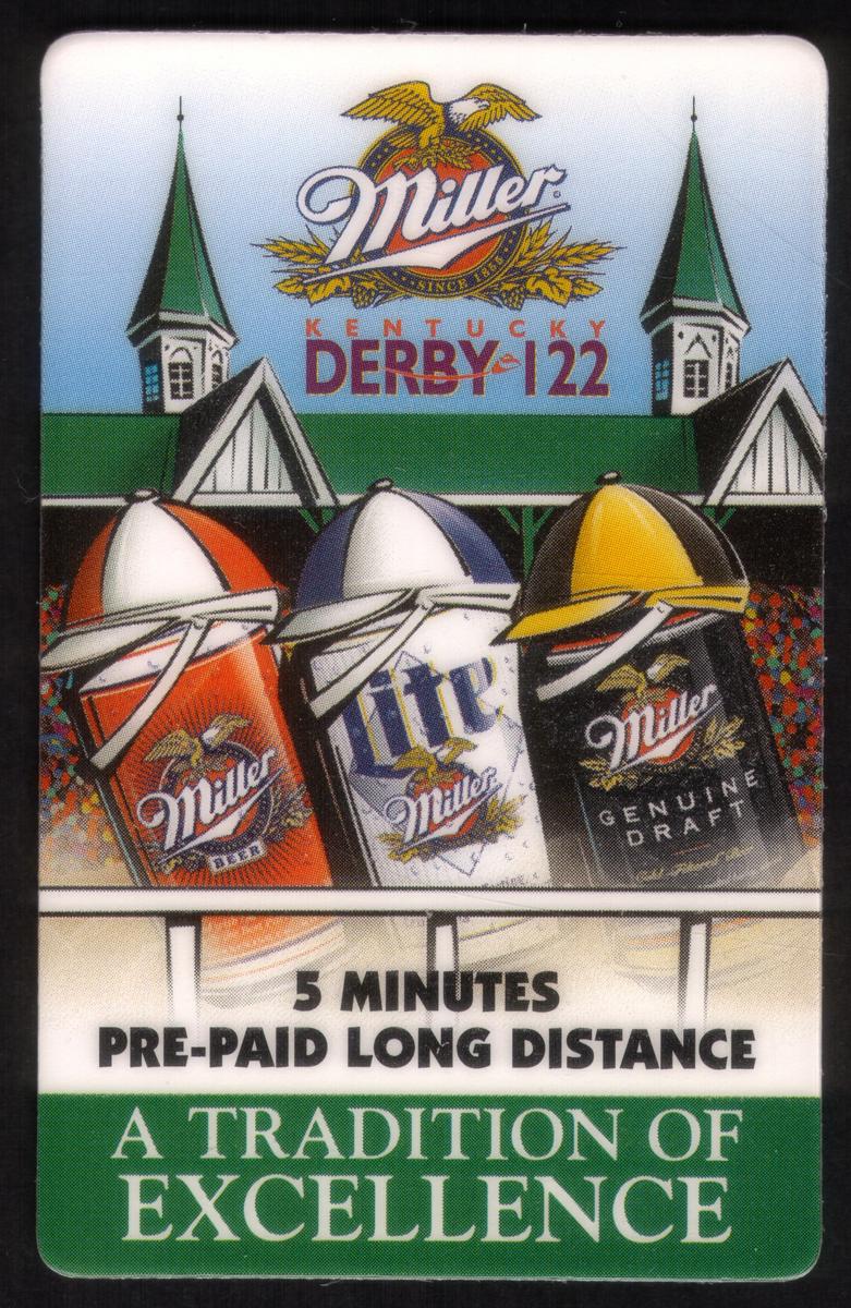 This telecard merges the excitement of the Kentucky Derby with the Miller Beer brand, celebrating both the popular horse racing event and the beverage sponsor in a visually engaging format. The design captures the essence of the sport and the festive atmosphere surrounding the Derby held at Churchill Downs.