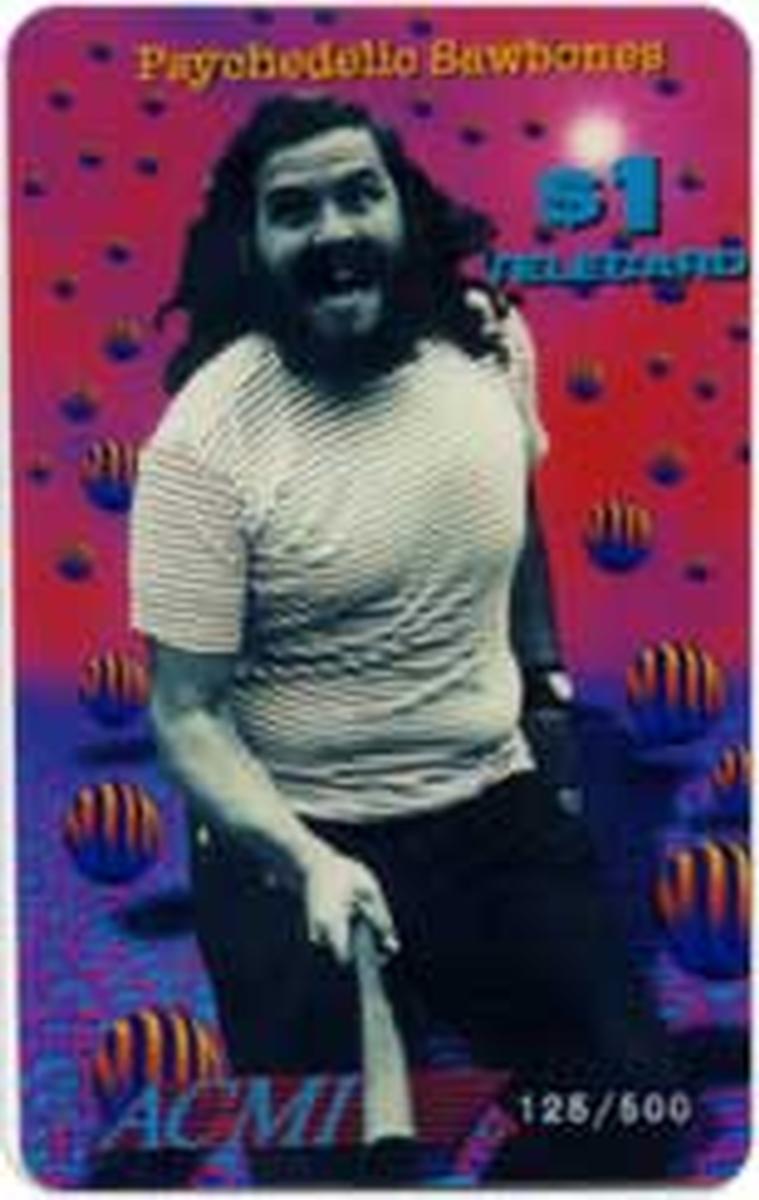 The card also includes references to the USTA, an important organization within the telephone card industry that helped shape telecard collecting in the United States. The artwork integrates intricate patterns and vivid colors that symbolize the creative spirit of the telecard community. Elements such as the text “Psychedelic Sawbones” and “ACMI” appear prominently, enhancing the collectible’s distinct appearance.