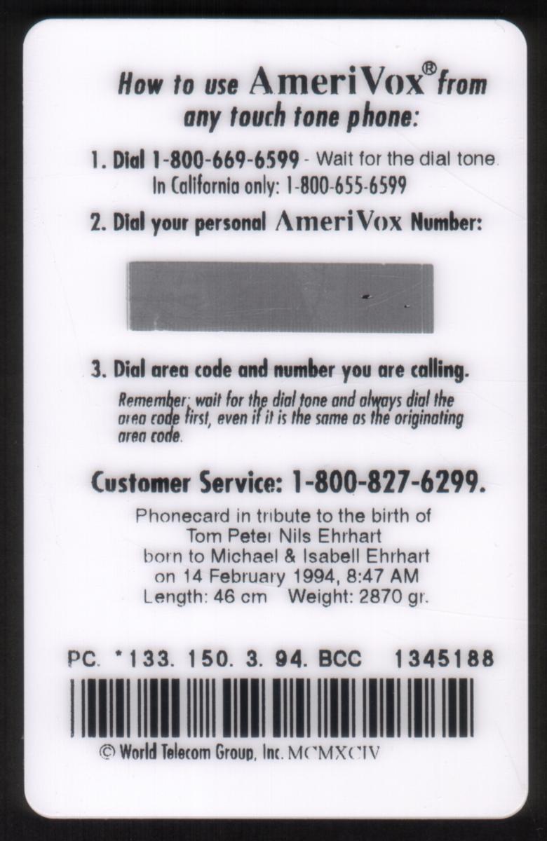 The upper left corner of the card displays the AmeriVox logo with the American flag, and the value "$5" is printed in bold blue in the upper right corner. The card highlights family and parenthood themes, prominently featuring the Ehrhart family names: Tom, Peter, Nils Ehrhart, Michael & Isabell Ehrhart. This card was issued in February 1994 and is titled "Proud New Parents & New Baby Inset Photo."