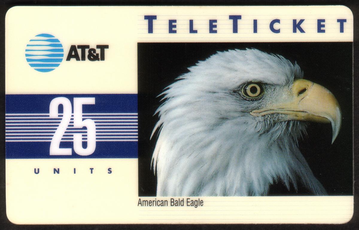 This collectible AT&T Teleticket phone card features an image centered on American Bald Eagles, a prominent symbol of American wildlife and national emblem. The design showcases one or more American Bald Eagles, known for their white-feathered heads and powerful presence, representing Americana and American symbolism. The depiction highlights these birds as an endangered species, emphasizing their status within wildlife conservation.