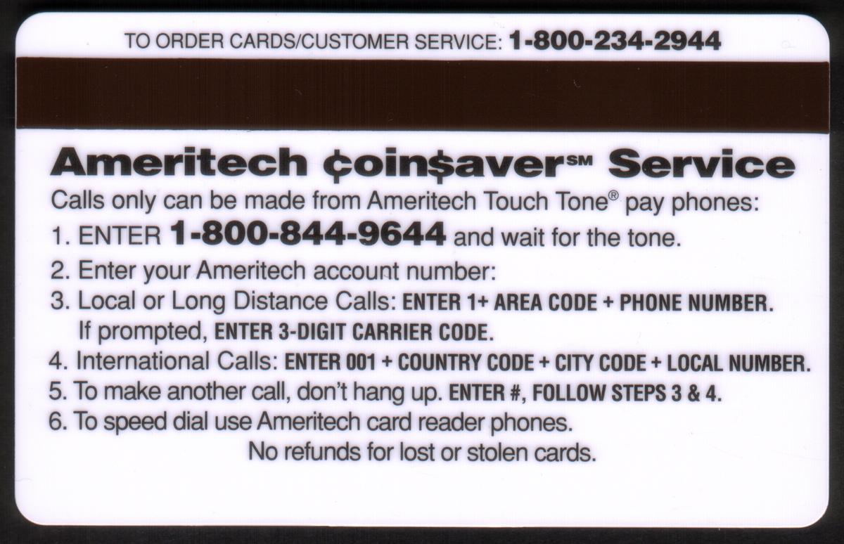 This collectible phone card features the Ameritech logo prominently at the top center, above the white-on-blue text "coin$aver" with a distinctive dollar sign replacing the letter "S." The card's background is primarily red, with a horizontal blue band across the upper third where the main branding appears.