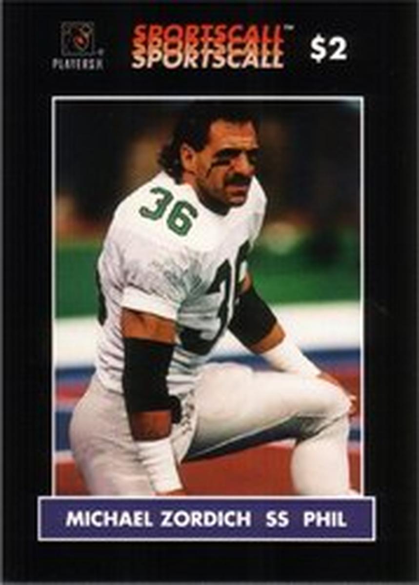 The card is printed on paper stock and is designed as a collectible item related to NFL football, specifically highlighting a player’s role and team. The focal point remains on Michael Zordich and his position as strong safety for the Philadelphia Eagles, making it a piece for fans and collectors of football memorabilia.