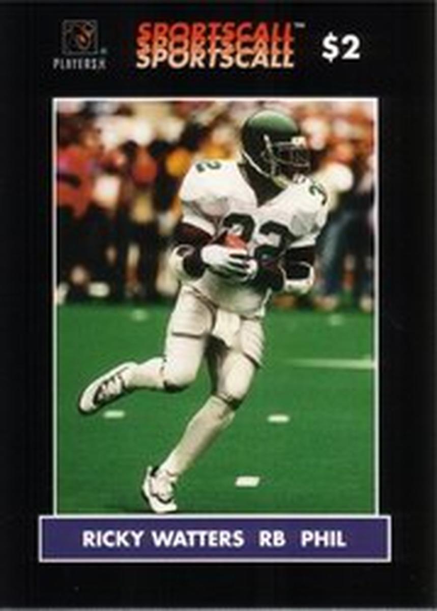 This collectible card features Ricky Watters, a running back (RB) for the Philadelphia Eagles in the National Football League (NFL). The card prominently displays a photograph of Ricky Watters in his Philadelphia Eagles football uniform, posed in action as a running back. The team colors and logo of the Philadelphia Eagles are visible, highlighting the sport of American football.