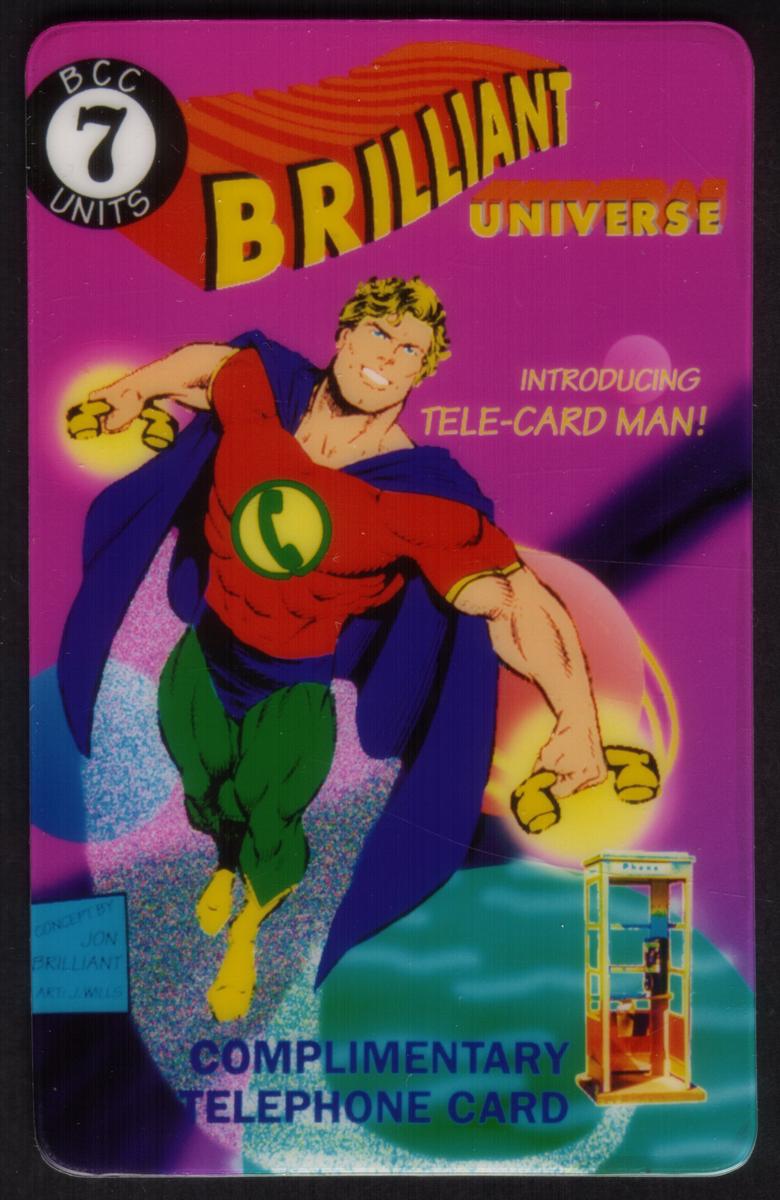 In the top left corner, there is a black circle with the number "7" and the text "BCC UNITS." The top center of the card prominently displays the bold yellow and orange 3D text "BRILLIANT UNIVERSE." To the right of Tele-Card Man, the phrase "INTRODUCING TELE-CARD MAN!" appears in uppercase yellow letters. At the bottom right, there is a small image of a retro-style telephone booth in bright yellow and blue, standing on a green and purple surface.
