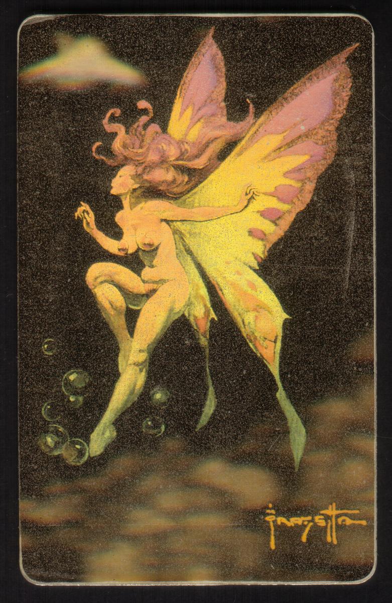 The second card depicts a nude fairy-like woman with large, ornate pink and yellow butterfly wings. She is mid-flight against a cloudy sky with bubbles floating around her. Her flowing hair and delicate posture evoke a sense of grace and ethereal beauty. This card also features Frank Frazetta’s signature in the bottom right.