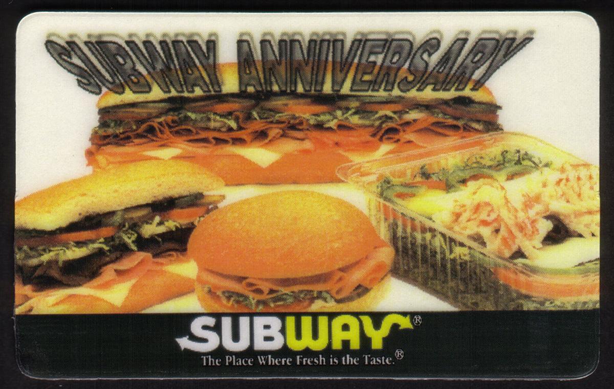 This collectible card commemorates the Subway Anniversary and prominently features the Subway logo, a registered trademark. The card displays a vivid image of three different Subway sandwich varieties: a hoagie-style sandwich stacked with deli meats and fresh vegetables, a round sandwich with layers of meat and greens, and a salad container filled with various fresh ingredients. Each food item showcases Subway’s focus on freshness and quality.
