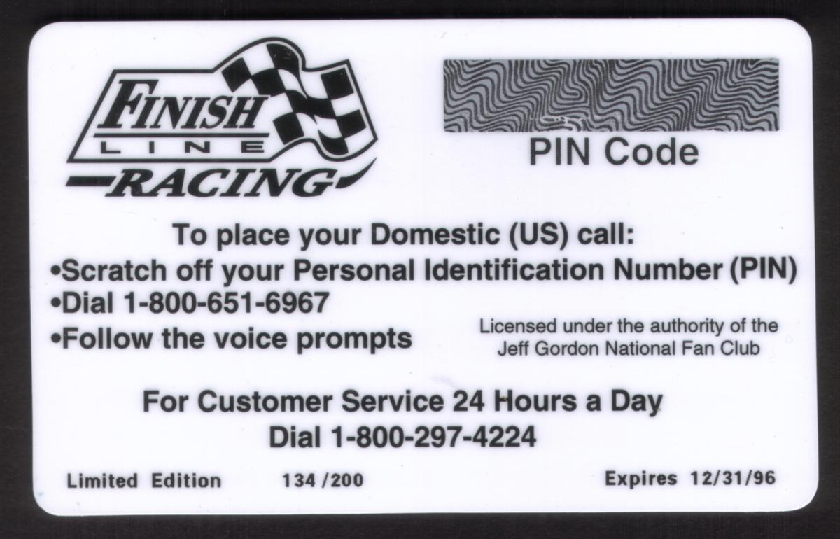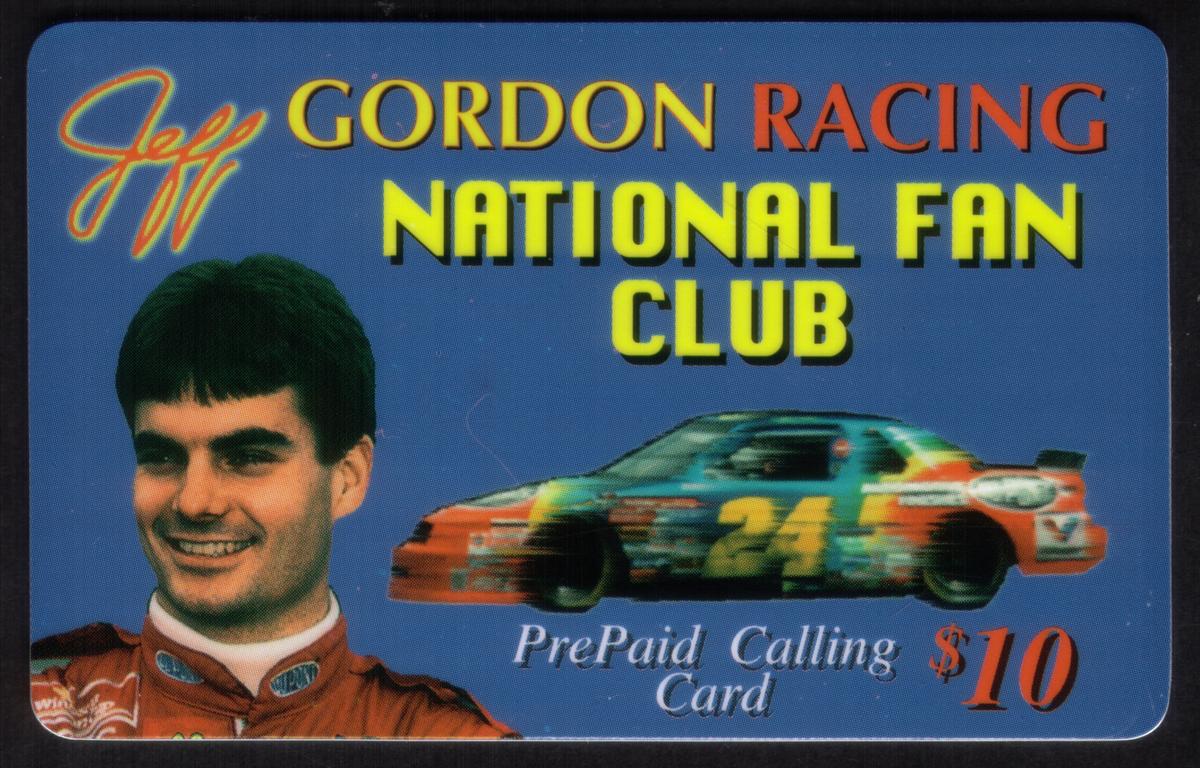 This collectible calling card highlights Jeff Gordon, a prominent NASCAR driver associated with Finish Line Racing, and is connected to the National Fan Club. The combination of text, imagery of Jeff Gordon and his race car, and a clear monetary denomination on the card make it a notable item for fans and collectors interested in automotive racing memorabilia.
