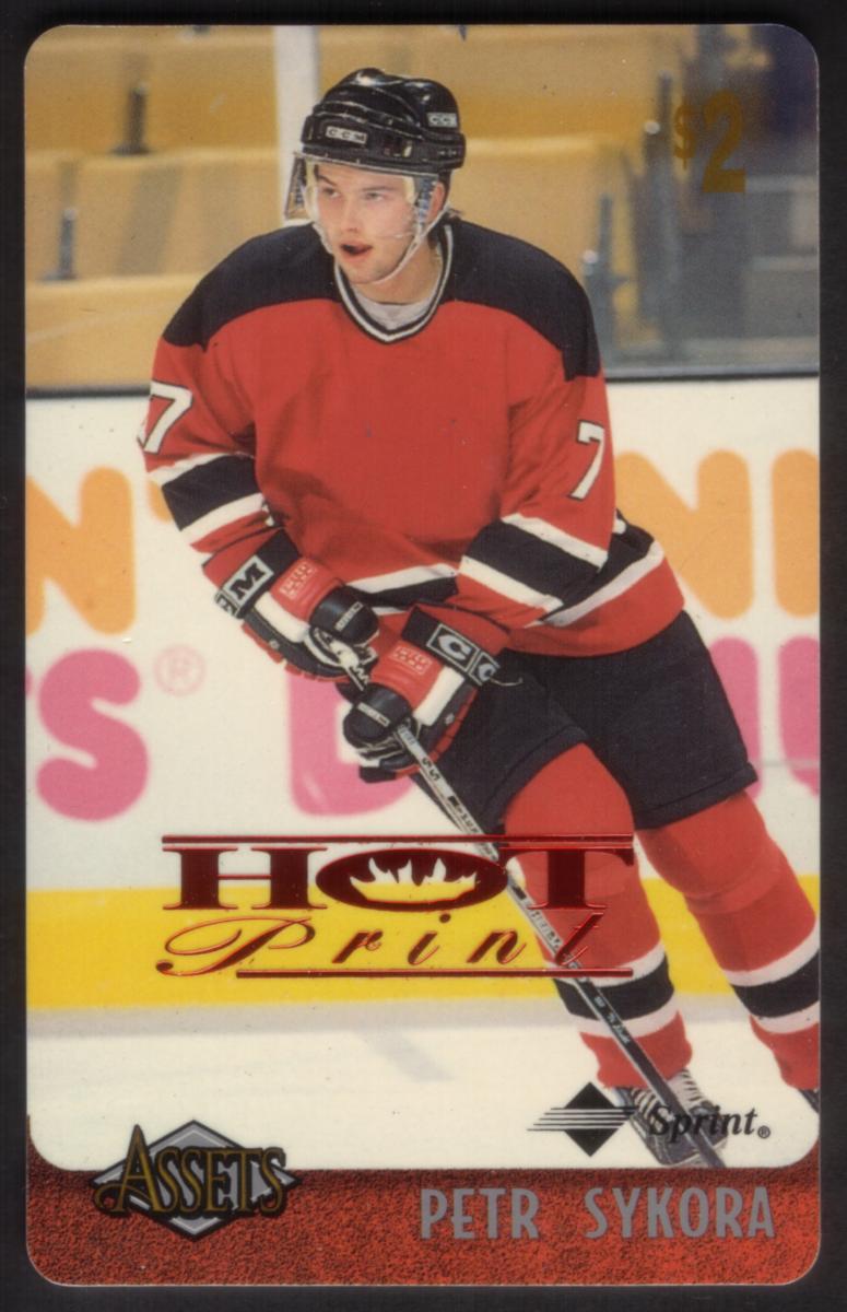 The background reveals part of the hockey rink, including the boards with advertisements featuring partial letters in orange and pink colors. The overall design highlights the National Hockey League player Petr Sykora, capturing his gameplay moment for collectors interested in hockey and NHL memorabilia.