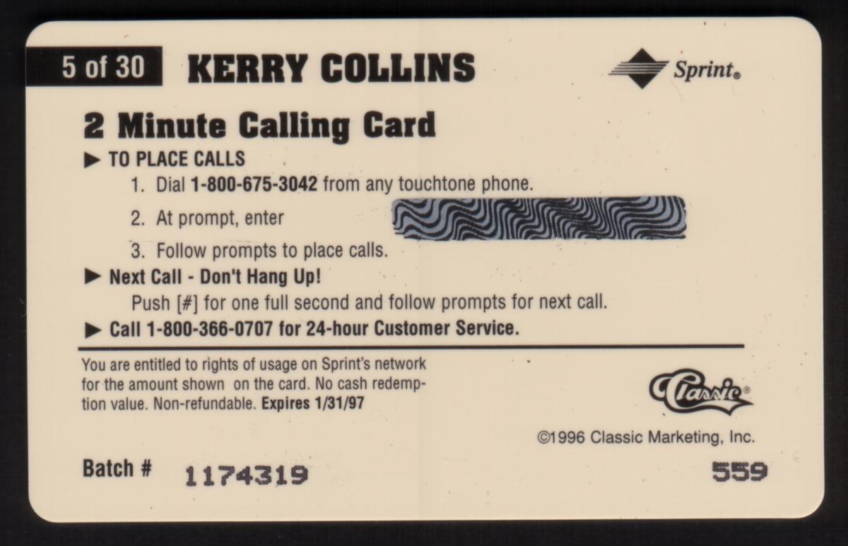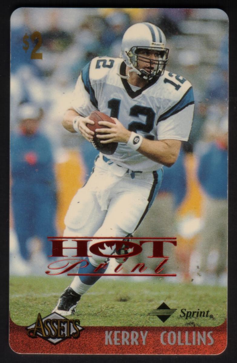 This collectible phone card features Kerry Collins, NFL quarterback, in full Carolina Panthers uniform during a football game. Collins is captured mid-play, holding a football with both hands as he prepares to pass or run. He wears the Panthers’ white away jersey with the number 12 displayed on his shoulders and chest. His helmet is silver with blue and black accents, matching the team colors.