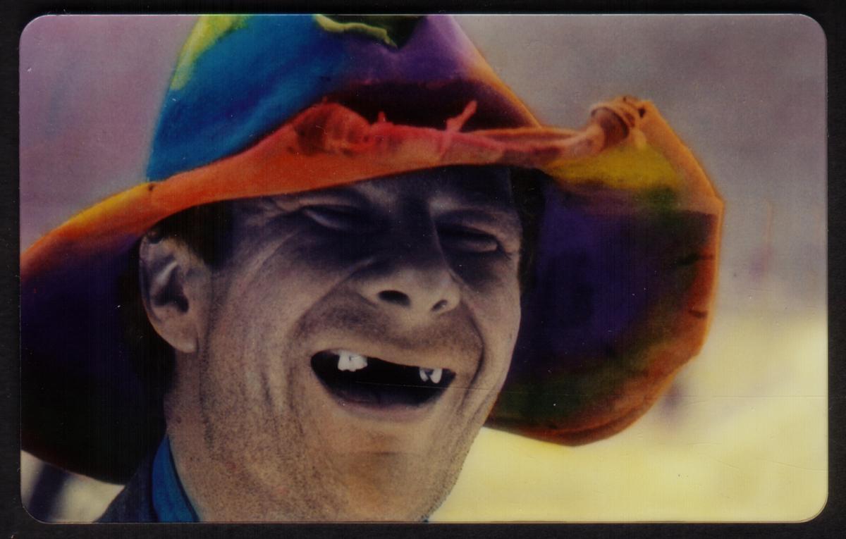 Vivid portrait featuring a grinning man with a missing tooth, colorful oversized hat, and a playful, nostalgic vibe perfect for collection. |