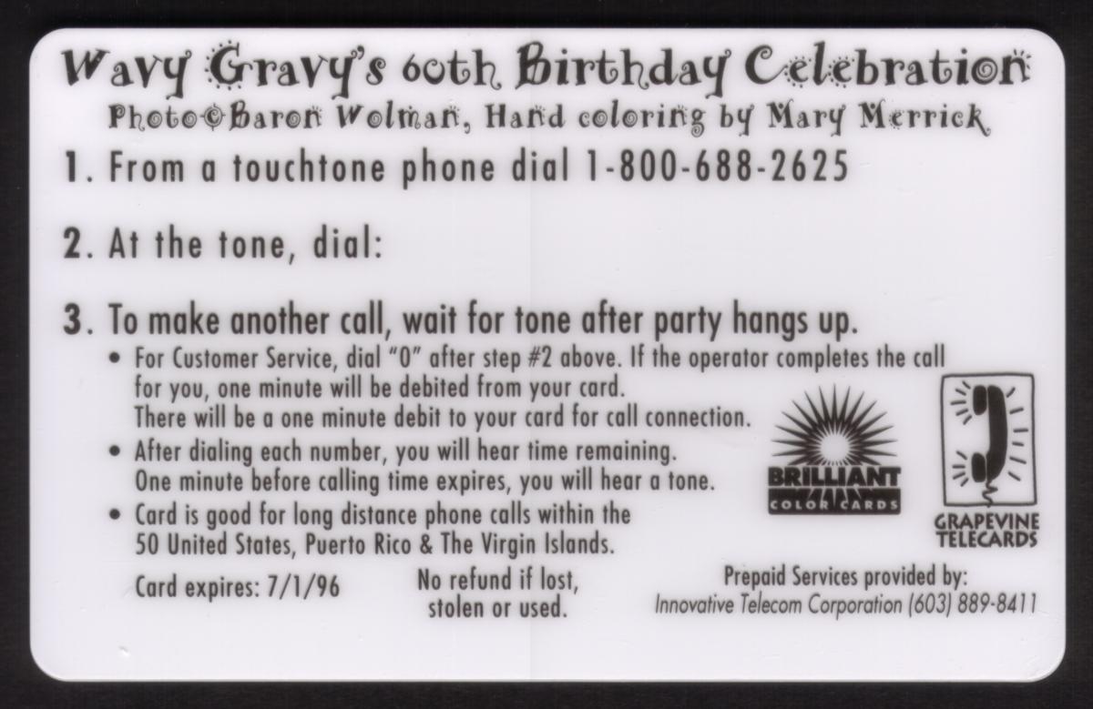 Issued by WorldCom, this phone card carries an expiration date of 1996 and is labeled as a specimen card. It belongs to the Grapevine Telecards series and highlights the cultural significance of Wavy Gravy in the context of 1960s entertainment and social activism. The vibrant imagery and historic portrait make it a valuable collectible for fans of that era and its figures.