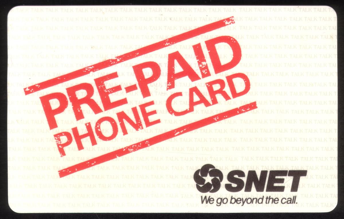 This collectible phone card features large, bold red text that reads "PRE-PAID PHONE CARD" angled slightly upwards, occupying most of the upper half of the card. The text appears inside a rectangular red border with a distressed effect, giving it a stamped look. Positioned toward the lower right corner is the SNET logo, consisting of a stylized circular emblem followed by the letters "SNET" in black bold typeface. Beneath the logo is the slogan "We go beyond the call." in smaller black font.