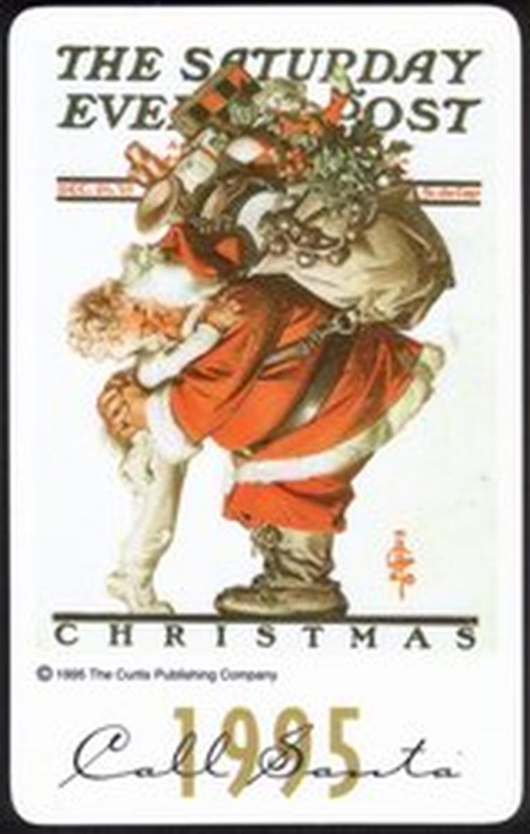 This card dates to 1995, as shown by the Saturday Evening Post reference and the overall art style. It clearly celebrates Christmas and the tradition of contacting Santa Claus during the holidays. The depiction emphasizes the historical portrayal of Santa in popular media and print, capturing the spirit of Xmas through expressive illustration evocative of Rockwell’s storytelling.