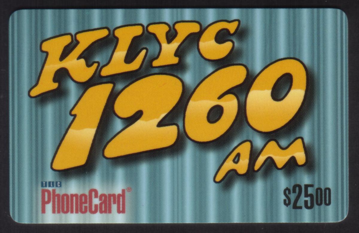 This collectible phone card features branding for KLYC Radio 1260 AM, a radio station. The card indicates a value of $25. The design includes text referencing "The Long Distance Co." and "Promotionals," emphasizing its connection to radio stations and news media. The card's artwork incorporates graphics consistent with radio broadcasting themes.