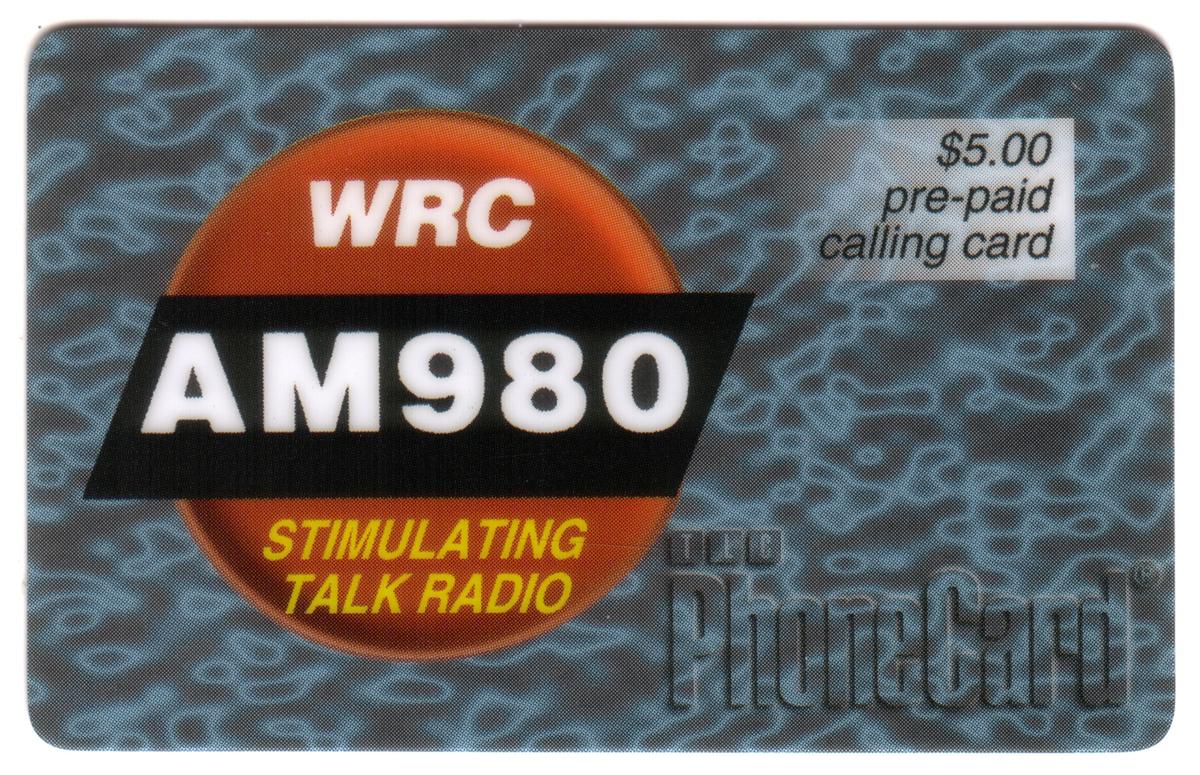 This collectible phone card features the branding of WRC Radio AM 980, a radio station known for its stimulating talk radio format. The card’s face displays the logo of WRC Radio AM 980 prominently, emphasizing its focus on talk radio and news media. The card is valued at $5, as indicated clearly on the front side.