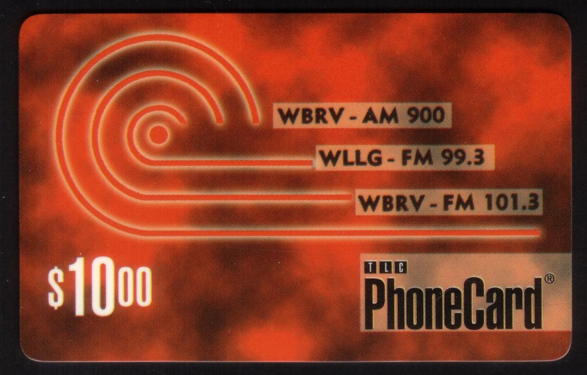This collectible chip card features logos for WBRV Radio and WLLG, indicating it is associated with the radio stations WBRV (broadcasting on 900 AM and 101.3 FM) and WLLG (99.3 FM). These stations appear to be connected with a company named The Long Distance Co. The card has a promotional value of $10.