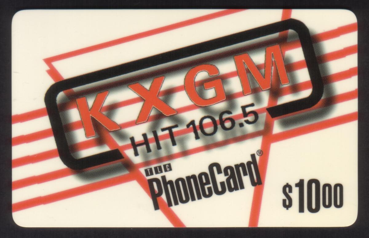 Overall, this $10 phone card serves as a collectible item linked to KXGM Radio’s Hit 106.5 FM, reflecting the branding and commercial promotion of this radio station and its services. The card represents an intersection of telecommunications and radio promotion, designed for use as a prepaid calling card with value clearly indicated.