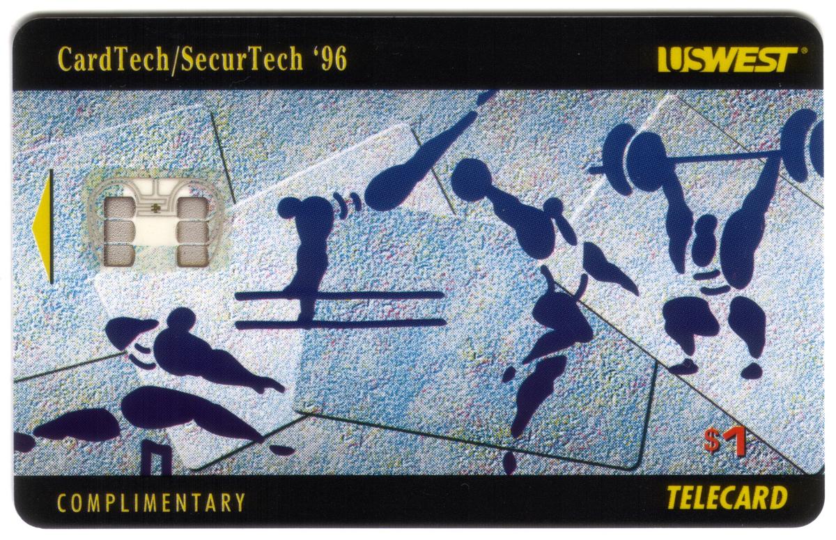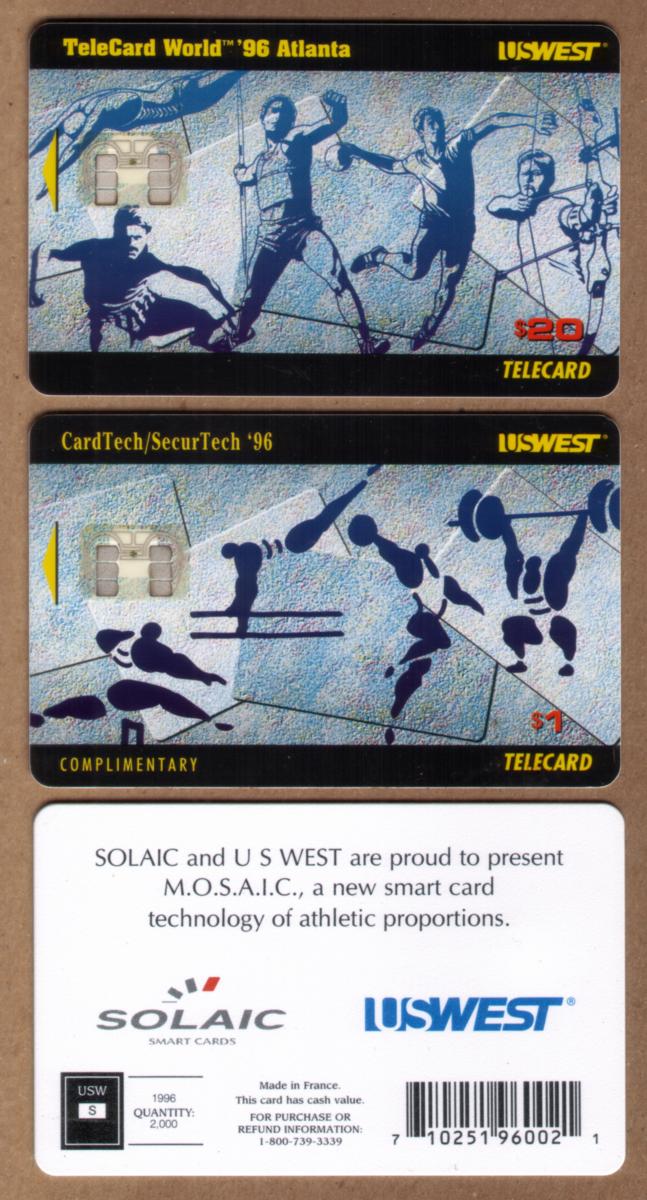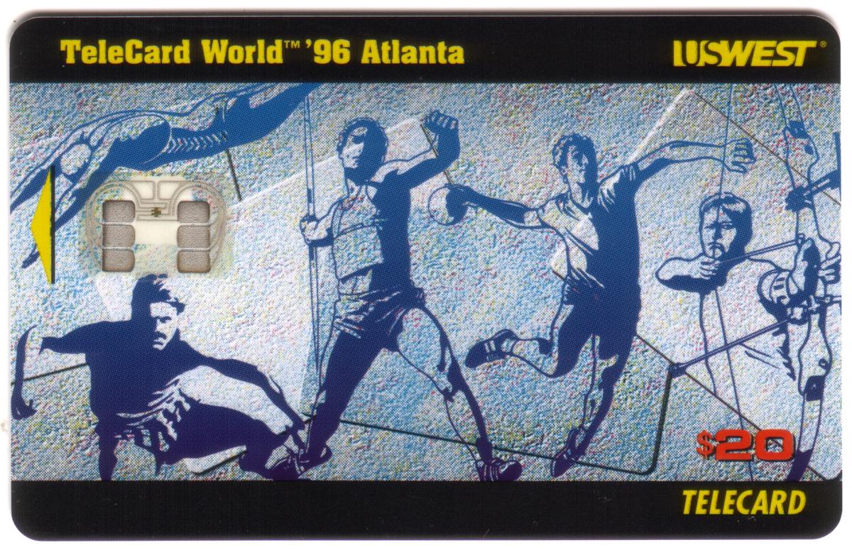 These two collectible chip cards are from the TeleCard World Sports Set of 2, issued by U.S. West Communications for CardTech/SecurTech ’96. Both cards feature athletic sports themes representing events from the 1996 Atlanta context.