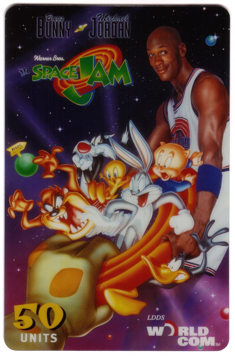 The bottom right corner includes the “LDDS WORLDCOM” logo in white, with the “LDDS” acronym placed above “WORLDCOM.” The entire card measures approximately 4 3/8 inches by 6 3/4 inches, making it a jumbo-sized phone card. This piece captures the crossover event between basketball legend Michael Jordan and beloved Looney Tunes characters from the Space Jam movie, blending entertainment, sports, animation, and cartoon characters.