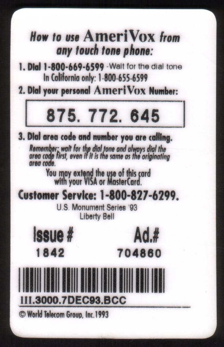 In the lower right corner, the card displays the AmeriVox logo, which includes a small American flag with an eagle and the map of the United States, alongside the text “AmeriVox” and the tagline “America’s New Voice in Calling.” This indicates the card is issued by AmeriVox, a telecommunications service provider.