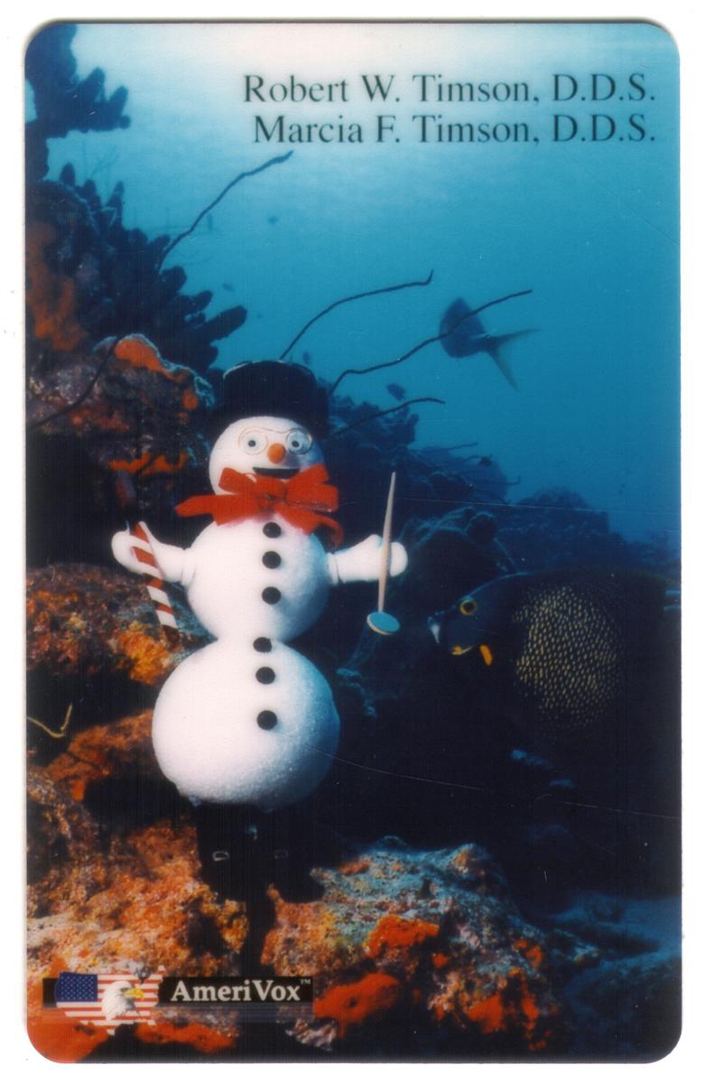 The overall design integrates the festive visual of snowmen with the natural beauty of aquatic life, combining holiday imagery with a unique underwater setting. The card is promotional in nature, highlighting both the Timsons’ dental practice and the underwater scene from Grand Cayman Island, making it a distinctive collectible item.