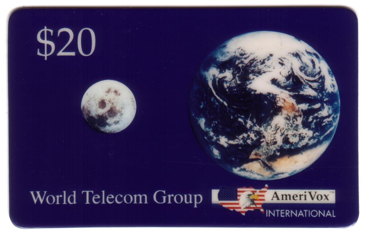 At the bottom of the card, "World Telecom Group" is printed in white capitalized font. To the right of this text is a small logo consisting of an outline of the continental United States filled with the American flag. Overlapping this is an eagle graphic with the word "AmeriVox" printed next to it. Below the logo, the word "INTERNATIONAL" appears in smaller white letters.
