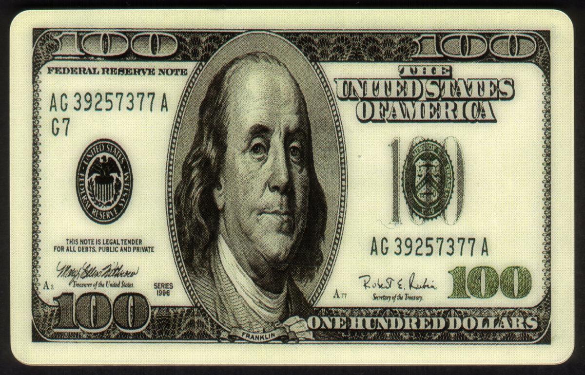Overall, this collectible card is part of the numismatic collectibles category, highlighting the iconic design of the United States $100 bill. It serves as a display or sample piece, featuring the likeness of Benjamin Franklin with a clear and detailed presentation consistent with official US currency designs.