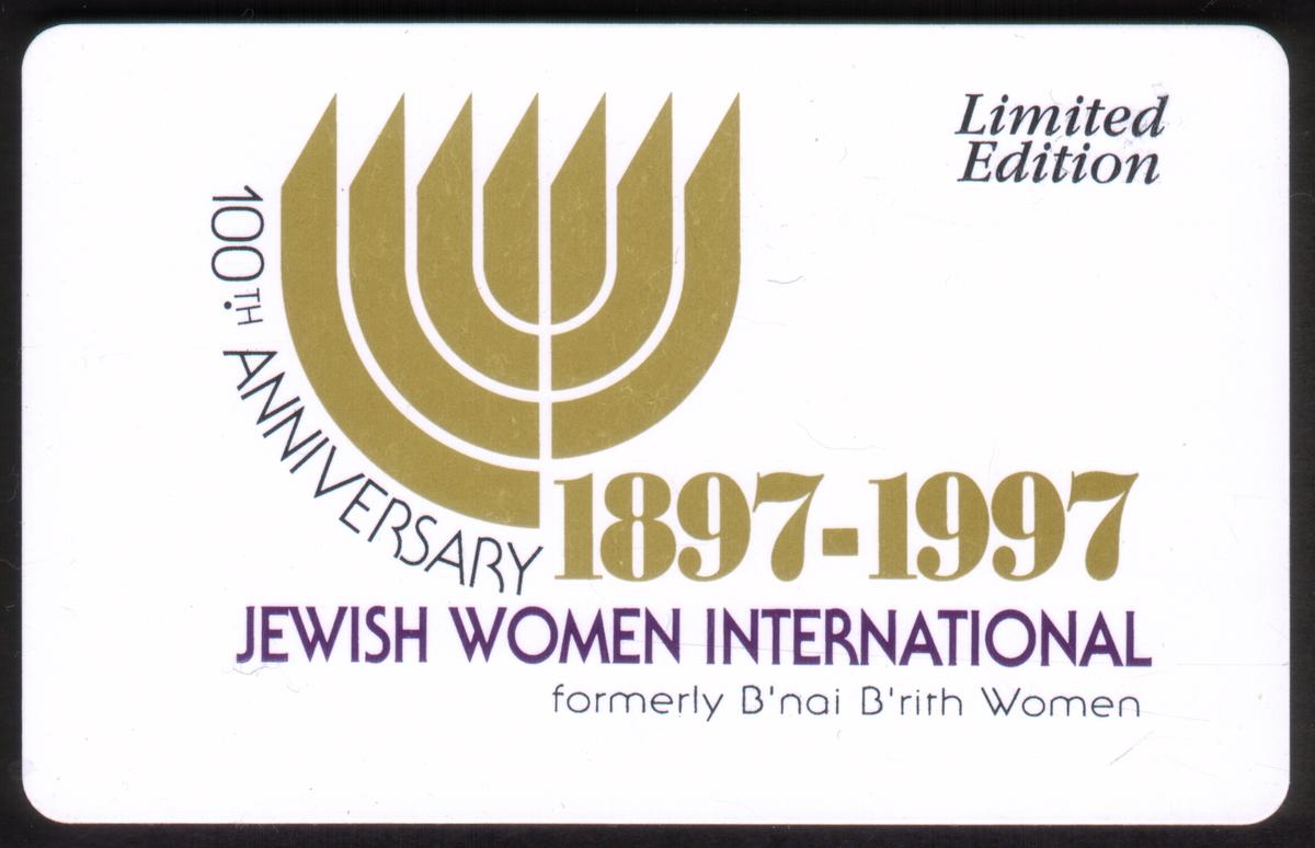 This card reflects themes of religion, Judaica, and support for non-profit religious organizations, specifically honoring the legacy and contributions of Jewish Women International within B’nai B’rith. The design aligns with religious and cultural significance tied to Judaism through the menorah motif and formal acknowledgment of the centennial celebration.