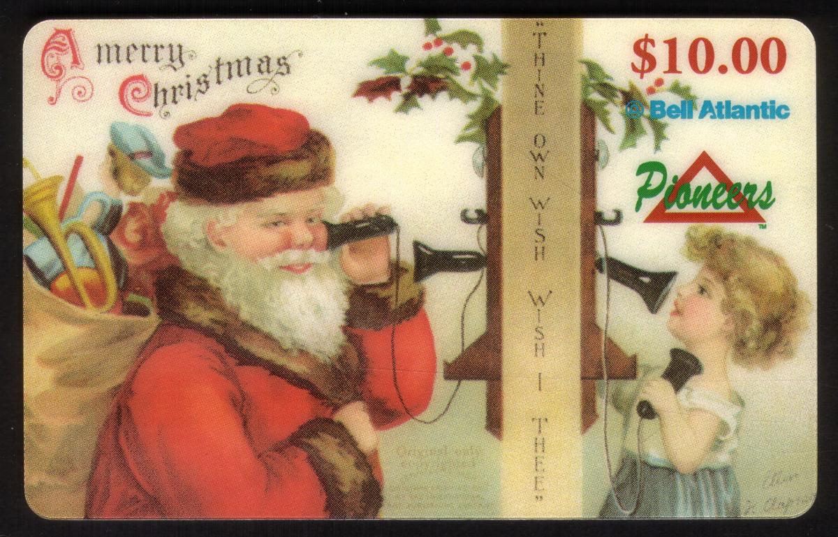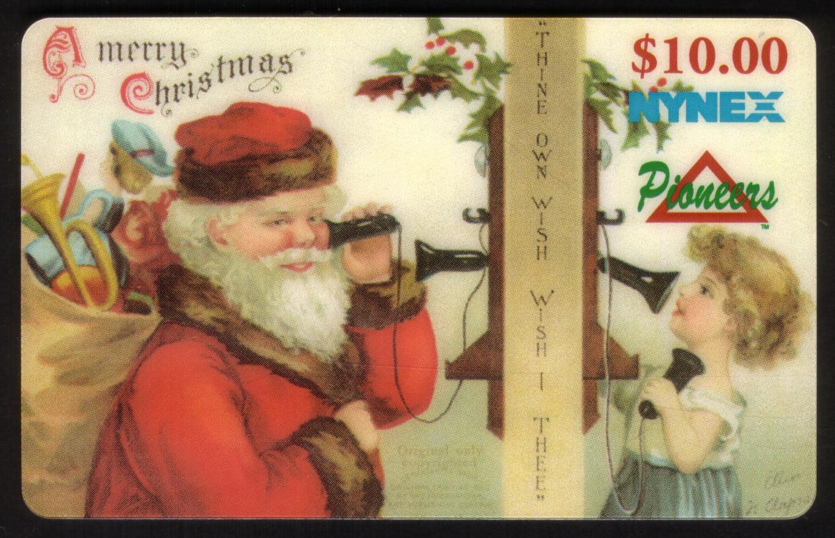 Vintage Christmas phone card featuring Santa, child with old-fashioned phone, holiday symbols, and a $10 value for prepaid calls. |