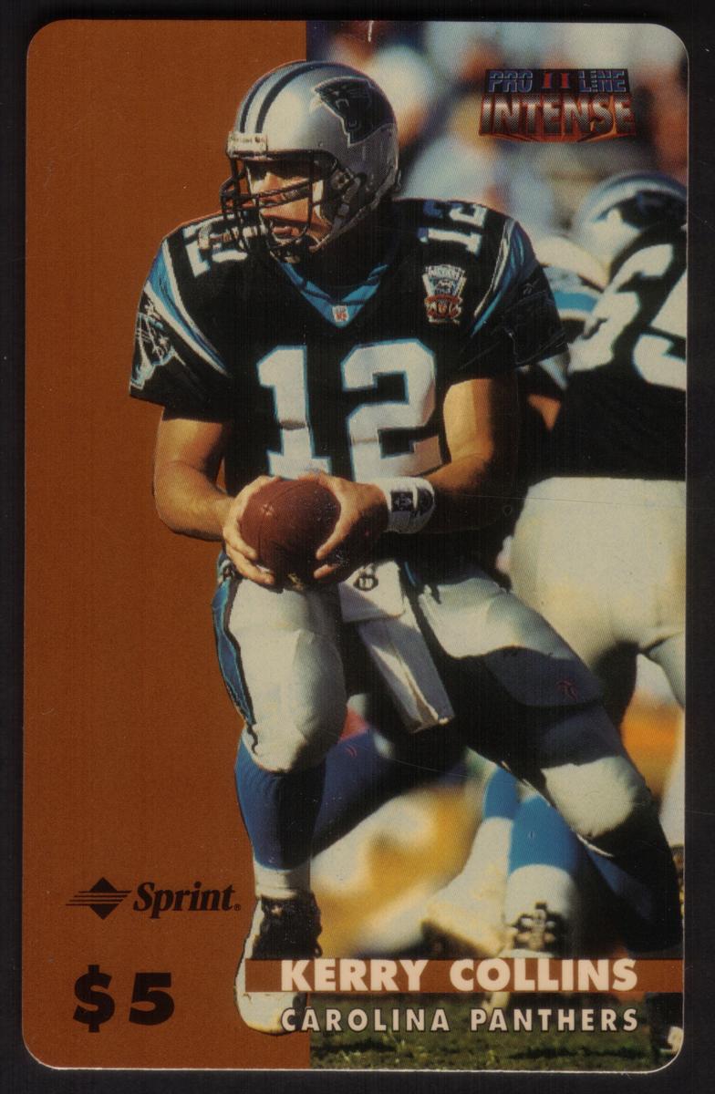 This collectible card features Kerry Collins, an NFL football player for the Carolina Panthers, depicted in full uniform with helmet and pads. The card prominently displays the logo of the Carolina Panthers and the National Football League shield. The design includes vibrant blue and white tones that highlight the team colors. Kerry Collins is shown in an athletic pose, emphasizing his role as a quarterback.