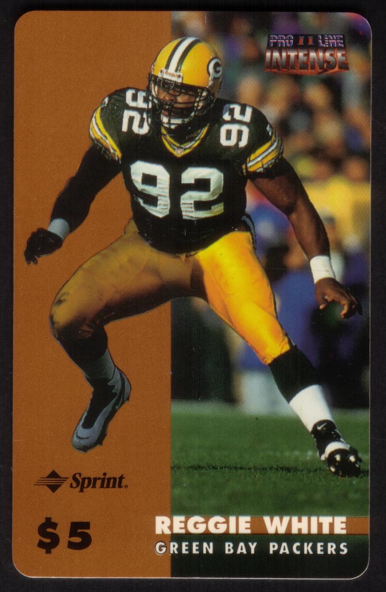 The card has a $5 denomination printed on it, signifying its value within the collectible series. The design integrates the NFL and National Football League branding, showcasing Reggie White as one of football’s most iconic defensive players. The player’s name is printed distinctly, solidifying his identity without any additional graphic elements or other player images on the front of the card.