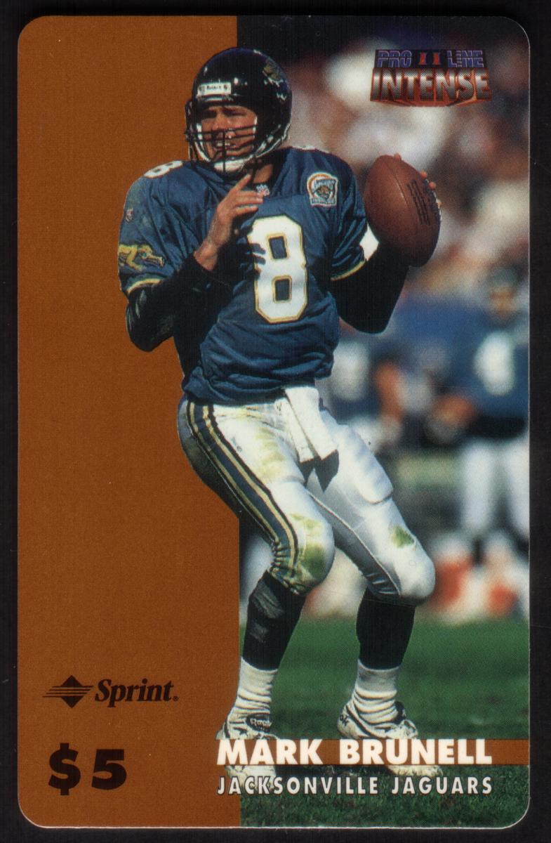 Overall, the card uses vivid colors and sharp photography to showcase Mark Brunell during his time with the Jaguars. The bottom of the card contains additional text including the $5 value, reinforcing its status as a collectible chip card from 1997, tied specifically to football and the NFL.
