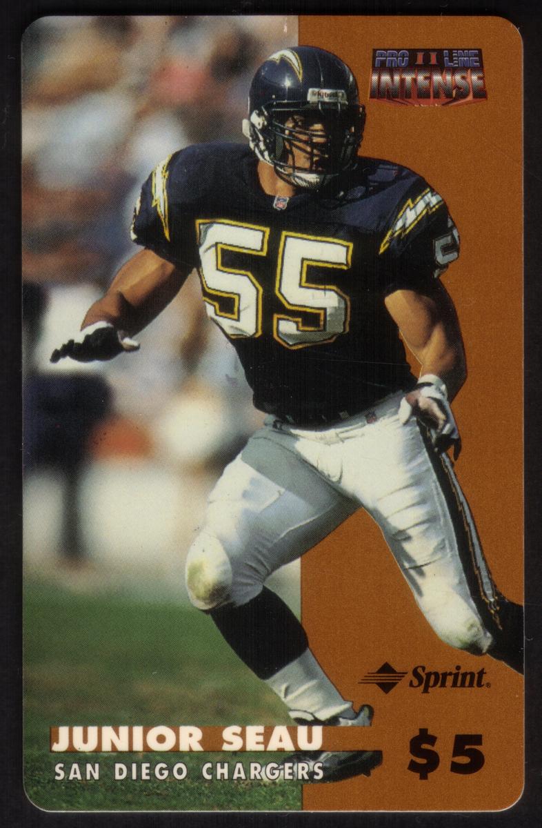 The image showcases Junior Seau in action, holding a football with a focused expression, wearing a silver helmet with the Chargers logo. The background includes team-related graphics and design elements consistent with football-themed memorabilia. Text on the card highlights the sport domain, confirming it pertains to professional football under the NFL umbrella.